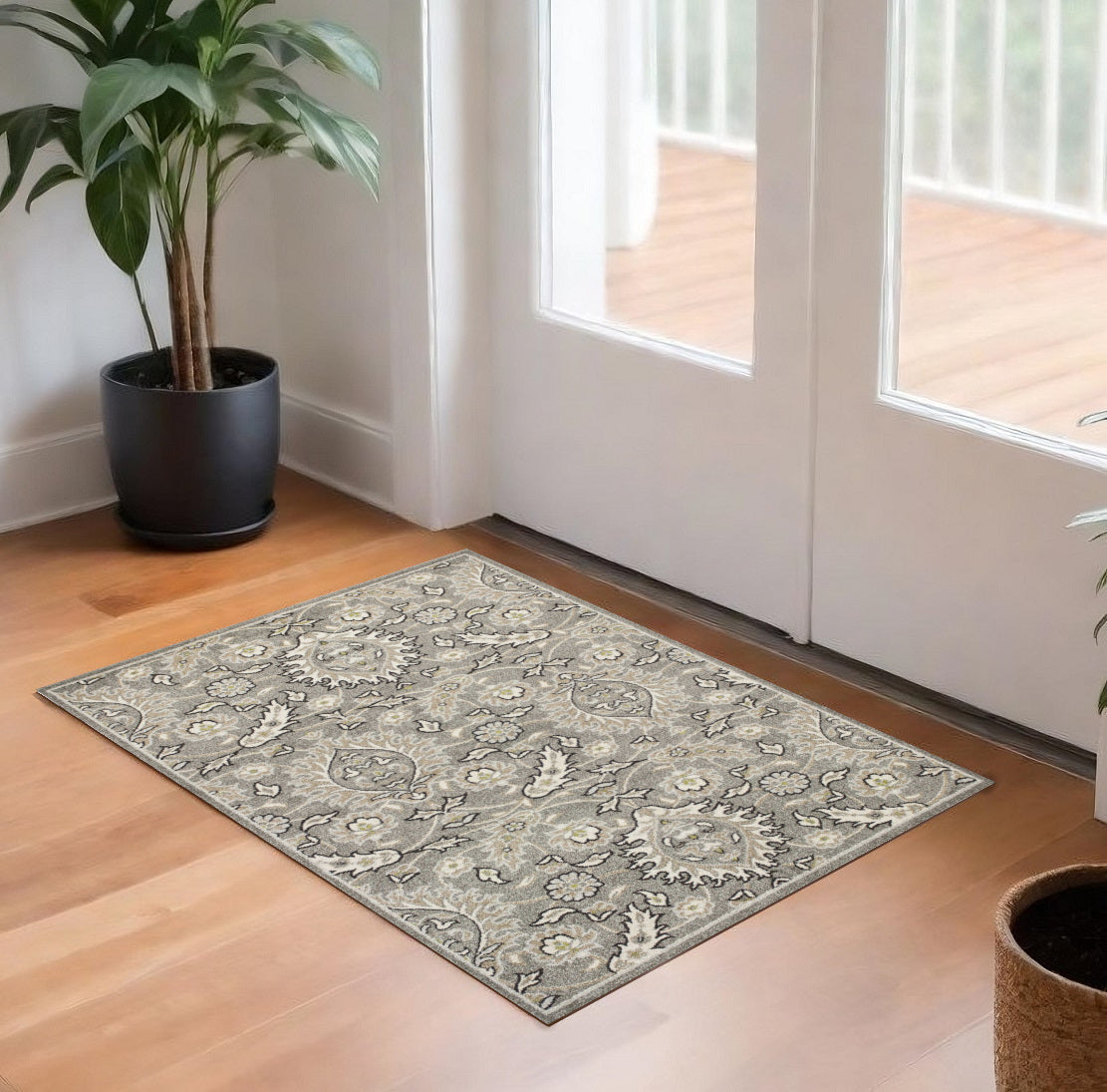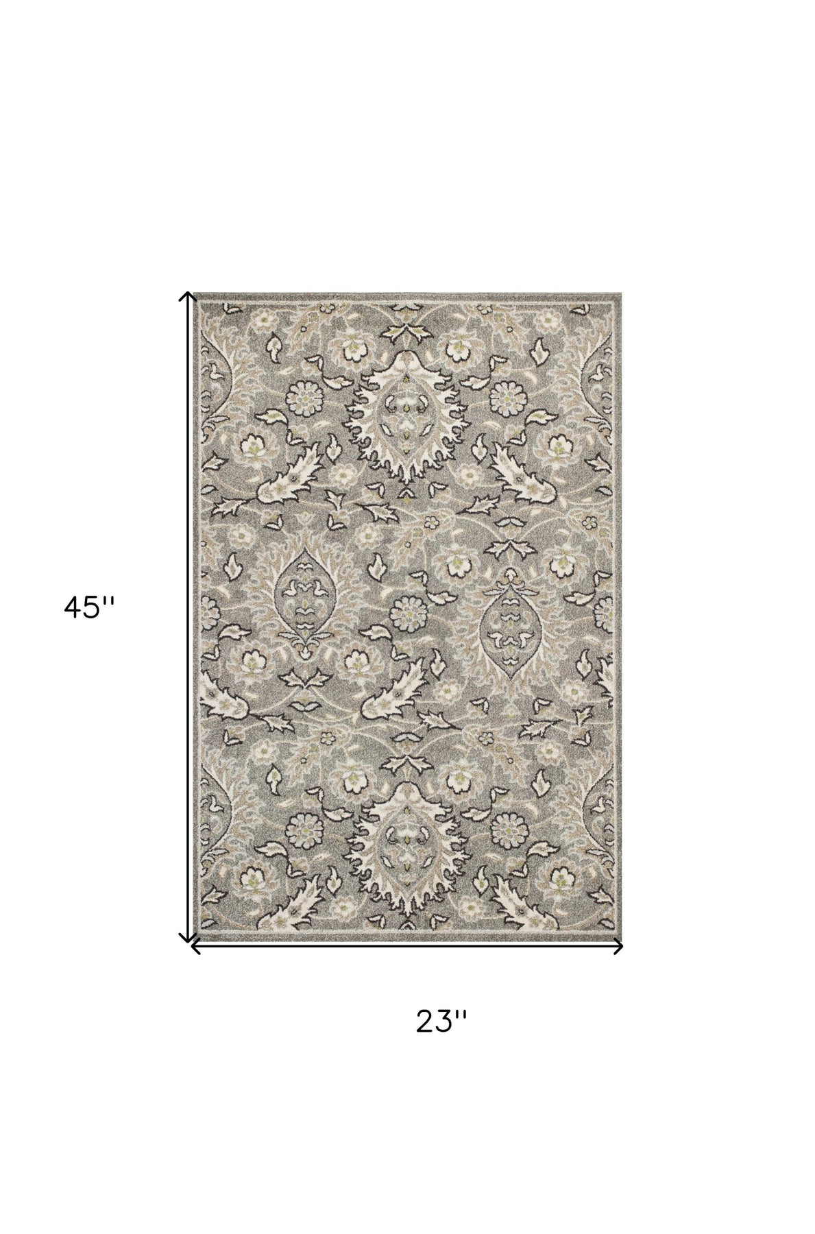 Set an inviting tone in your space with this 2-foot x 4-foot gray and ivory floral area rug. This rectangle shaped rug features a floral design in gray and ivory to give it visual interest. A classic shape marries with good looking design for your space place this area rug against a hardwood or tile floor and it will enliven your living space with style and sophistication. 23-inch H x 45-inch W x 0.5-inch D