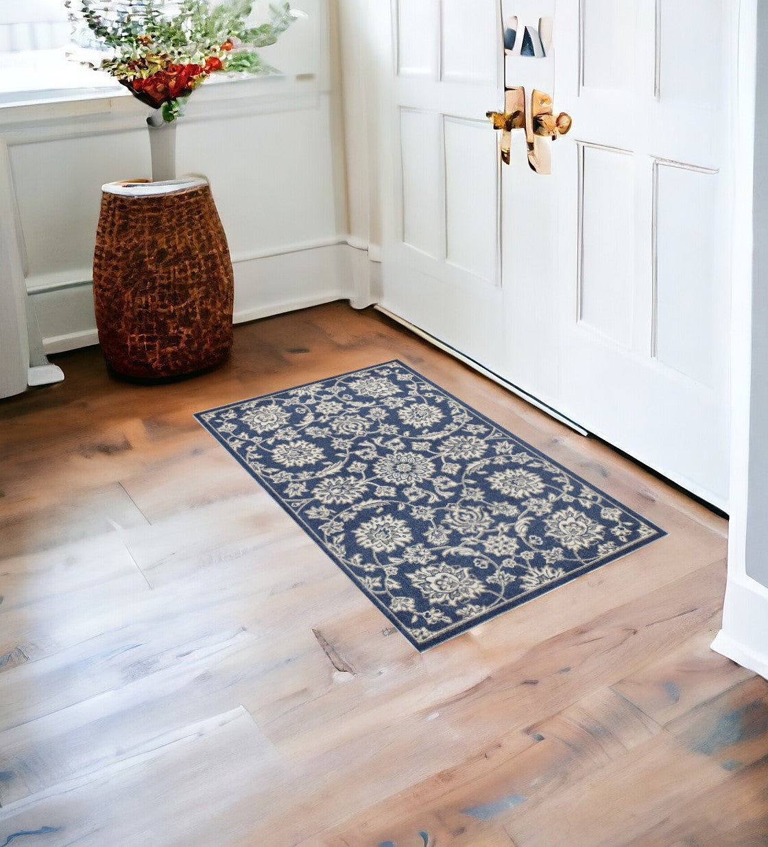 This 2-foot x 3-foot blue and ivory area rug not only adds warmth but also brings a sense of homeliness to any room. Crafted using durable polypropylene material in a machine-made construction, this rectangular rug features a traditional style. The machine-woven technique ensures quality and longevity, making it a stylish and practical addition to your decor. The blue and ivory color combination adds a touch of elegance, effortlessly blending into any interior setting. 23-inch H x 45-inch W x 0.5-inch D