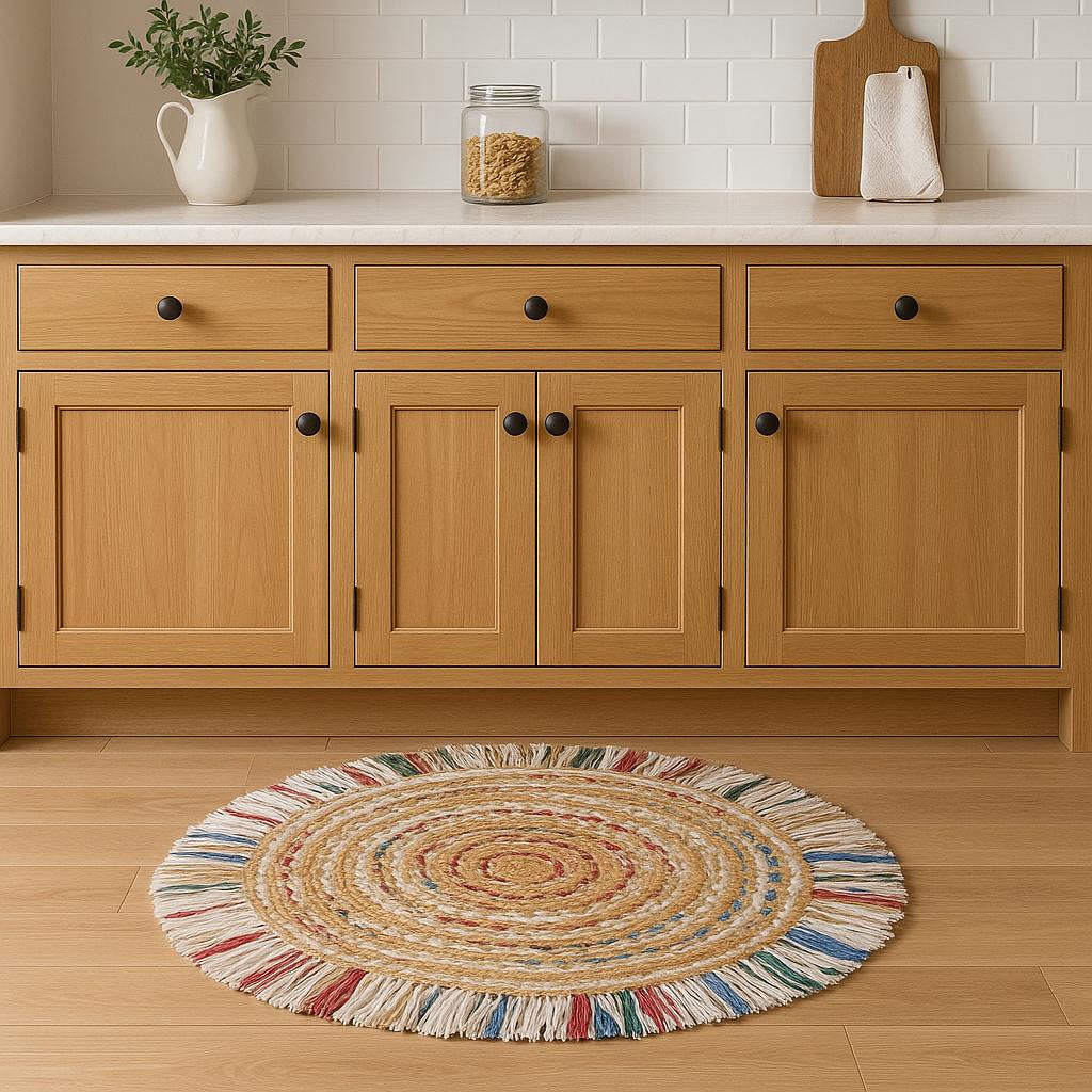 Set an inviting tone in your space with this 4-foot blue and white hand woven round rug. Crafted by skilled artisans, this hand woven rug is genuine and unique. No two will be exactly alike. Rugs are a great way to showcase your style, hide imperfections, warm your home and reduce noise. This smaller sized, classic styled rug is just what you need for your walkway, bedside, in front of door, cabinet, refrigerator, or chair. 42-inch h x 42-inch w x 0.5-inch d.