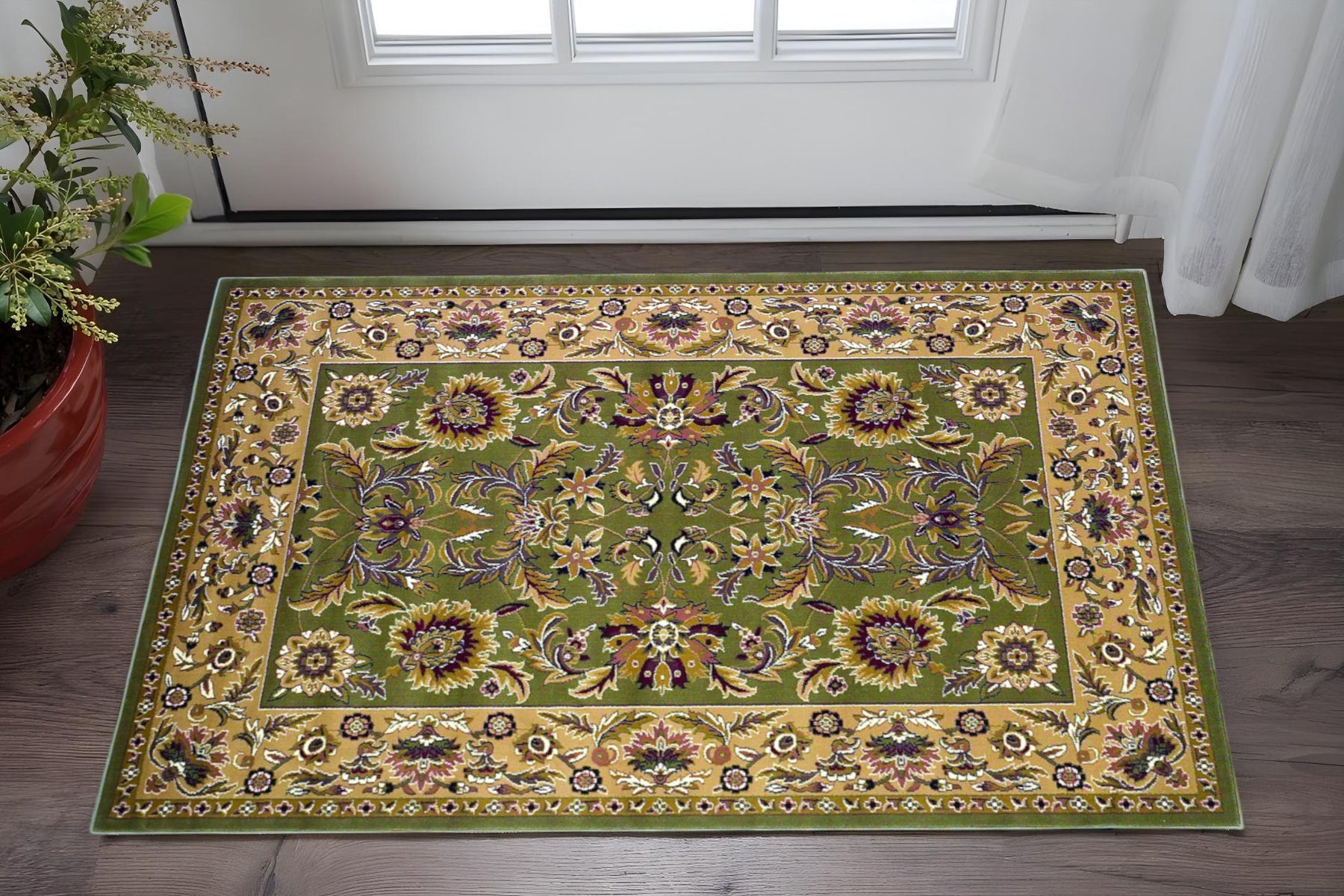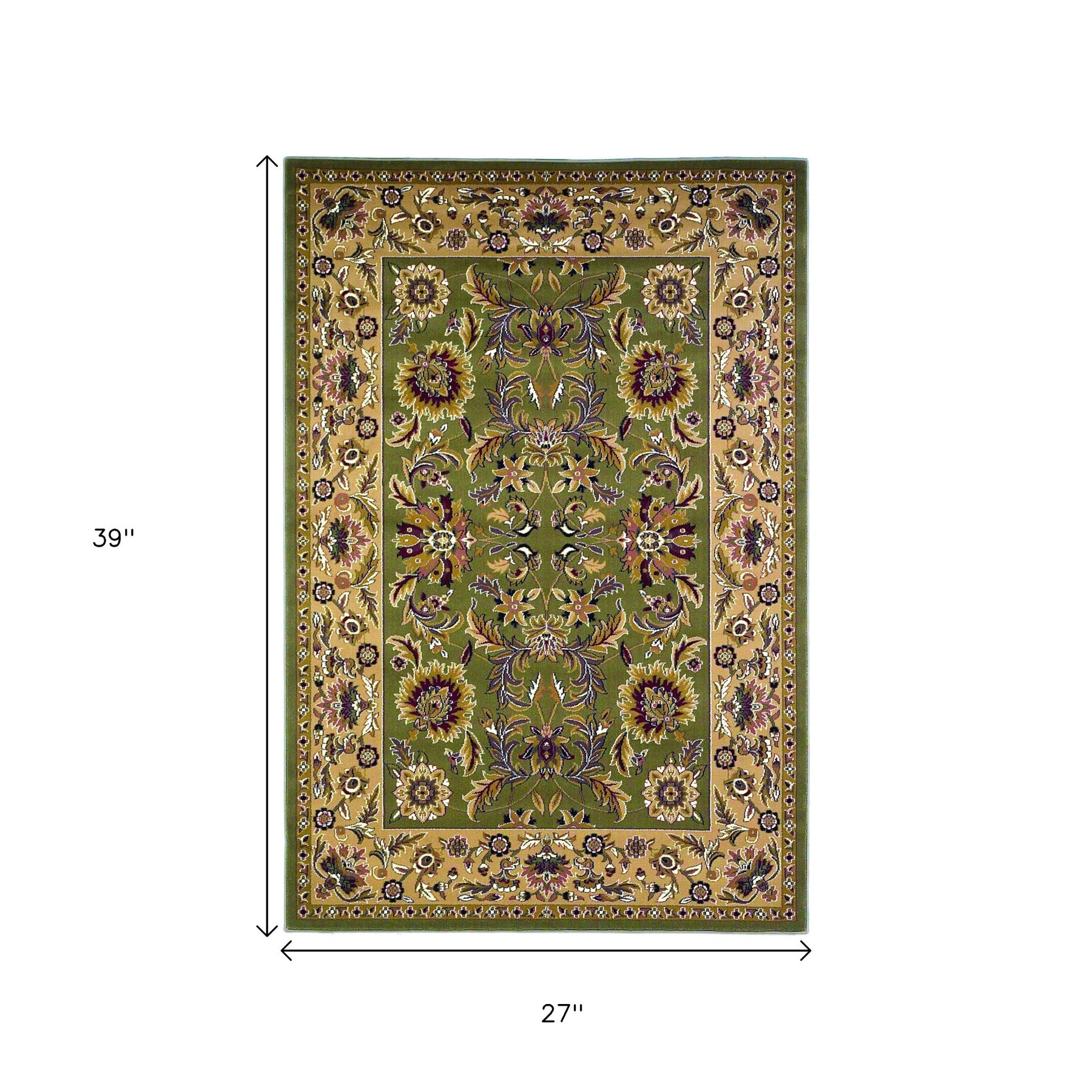 This 2-foot x 3-foot green and taupe floral area rug, is a great way to add warmth to a room. Ideal for spaces with kids and pets, this rug is stain resistant to help repel dirt and spilled liquids. Built to last, this rug crafted from polypropylene fibers is known for its durability and long lasting appeal. Rugs are a great way to showcase your style, hide imperfections, warm your home and reduce noise. This smaller sized, traditional styled rug is just what you need for your walkway, bedside, in front of door, cabinet, refrigerator, or chair. 27-inch h x 39-inch w x 0.5-inch d.