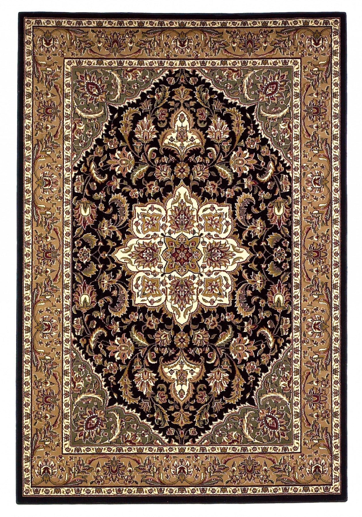 Add great coloration and comfortable texture to your space with this 2-foot x 3-foot black and beige floral medallion area rug. Ideal for spaces with kids and pets, this rug is stain resistant to help repel dirt and spilled liquids. Built to last, this rug crafted from polypropylene fibers is known for its durability and long lasting appeal. Rugs are a great way to showcase your style, hide imperfections, warm your home and reduce noise. This smaller sized, traditional styled rug is just what you need for your walkway, bedside, in front of door, cabinet, refrigerator, or chair. 27-inch h x 39-inch w x 0.5-inch d.