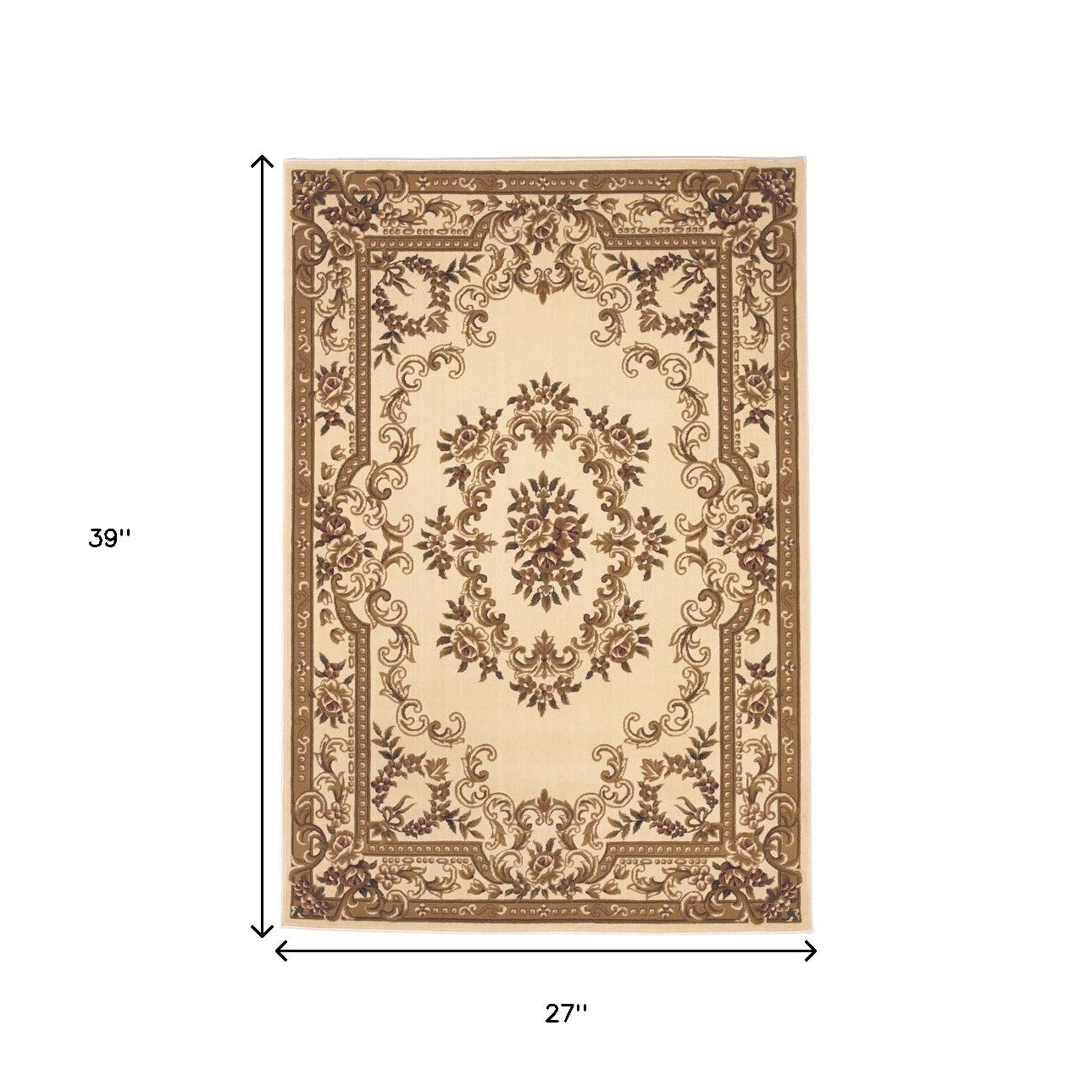Set an inviting tone in your space with this 2-foot x 3-foot ivory and beige floral medallion area rug. Ideal for spaces with kids and pets, this rug is stain resistant to help repel dirt and spilled liquids. Built to last, this rug crafted from polypropylene fibers is known for its durability and long lasting appeal. Rugs are a great way to showcase your style, hide imperfections, warm your home and reduce noise. This smaller sized, traditional styled rug is just what you need for your walkway, bedside, in front of door, cabinet, refrigerator, or chair. 27-inch h x 39-inch w x 0.5-inch d.