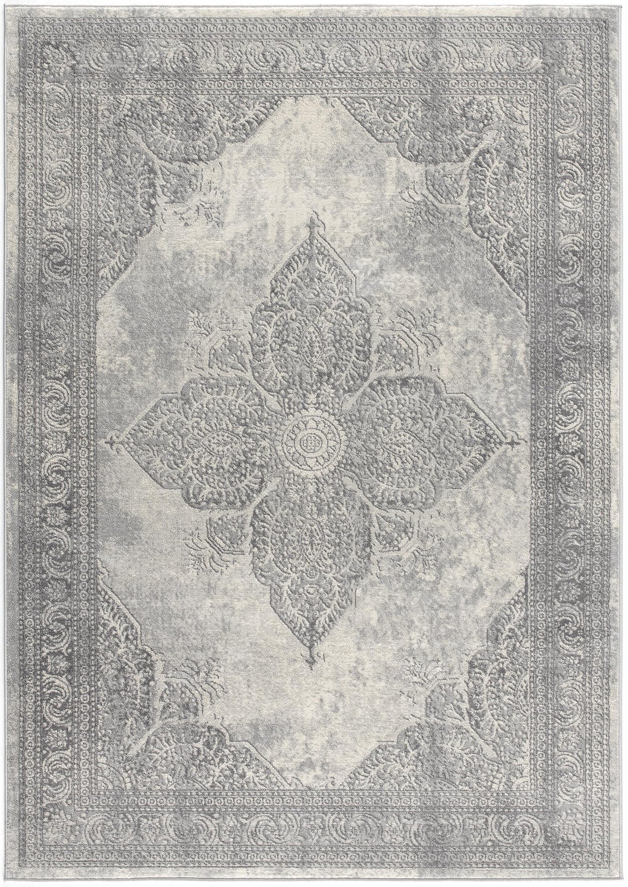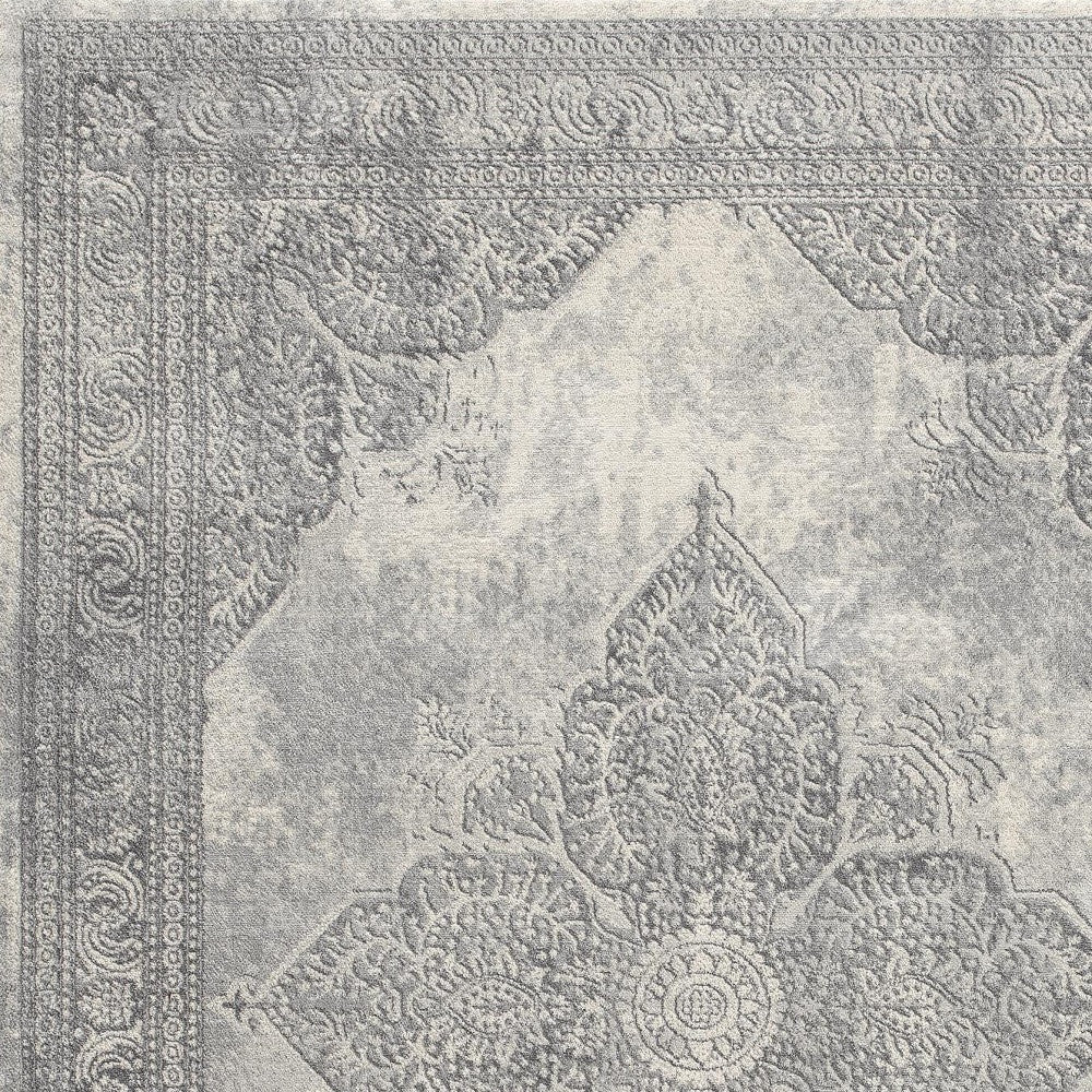 Wrapped in simplicity with traditional motifs and modern hues, this Gray Distressed Medallion Area Rug will serve as a classic accent to complement the aesthetics of your home. The four-petaled floral medallion in the center is extravagantly detailed in gray with a richly decorative border all-around lying over a distressed dove gray base. Made in Turkey with 100% polypropylene to stand the test of durability and resist stains in high traffic indoor areas. The high-low pile construction adds to a surface texture for a luxurious look with a soft and sumptuous feel under the feet. Roll this aesthetically pleasing area rug against a dark-colored floor to let it speak through its understated elegance. 39Ó x 24Ó x 0.4Ó