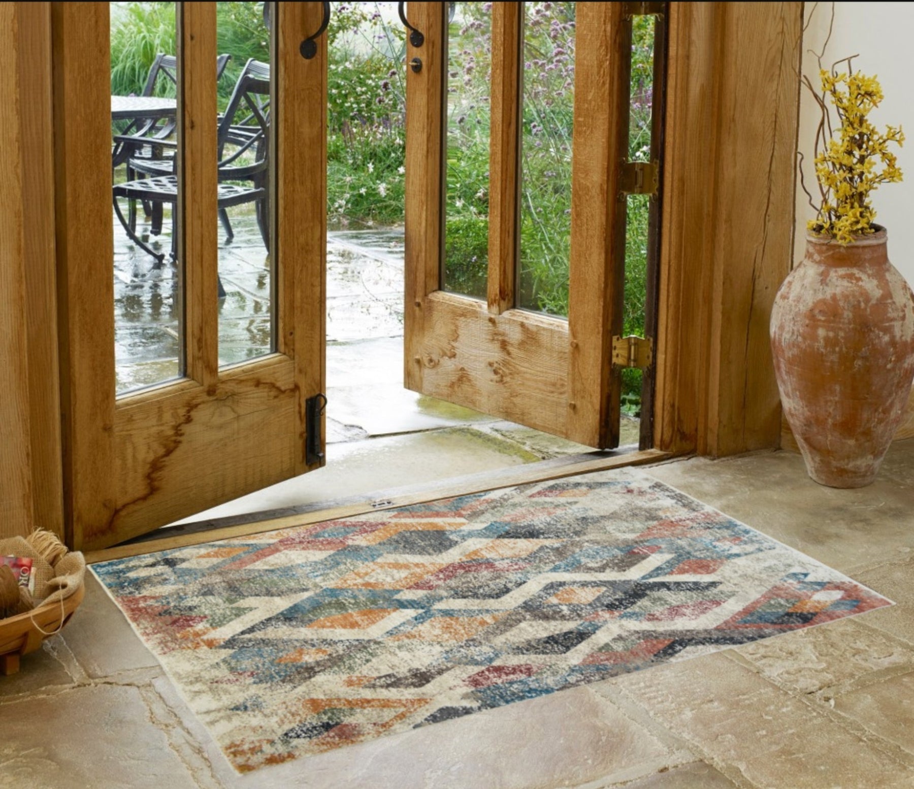 Set an inviting tone in your space with this 2-foot x 3-foot beige blue and gray geometric distressed area rug with fringe. This rectangle shaped rug features a geometric design in multiple colors including beige blue and gray to give it visual interest. A classic shape marries with good looking design for your space ideal for spaces with kids and pets, this rug is stain resistant to help repel stains and spilled liquids. Small fringed ends bring a timeless and fashionable look to your interior. 25-inch H x 39-inch W x 0.39-inch D