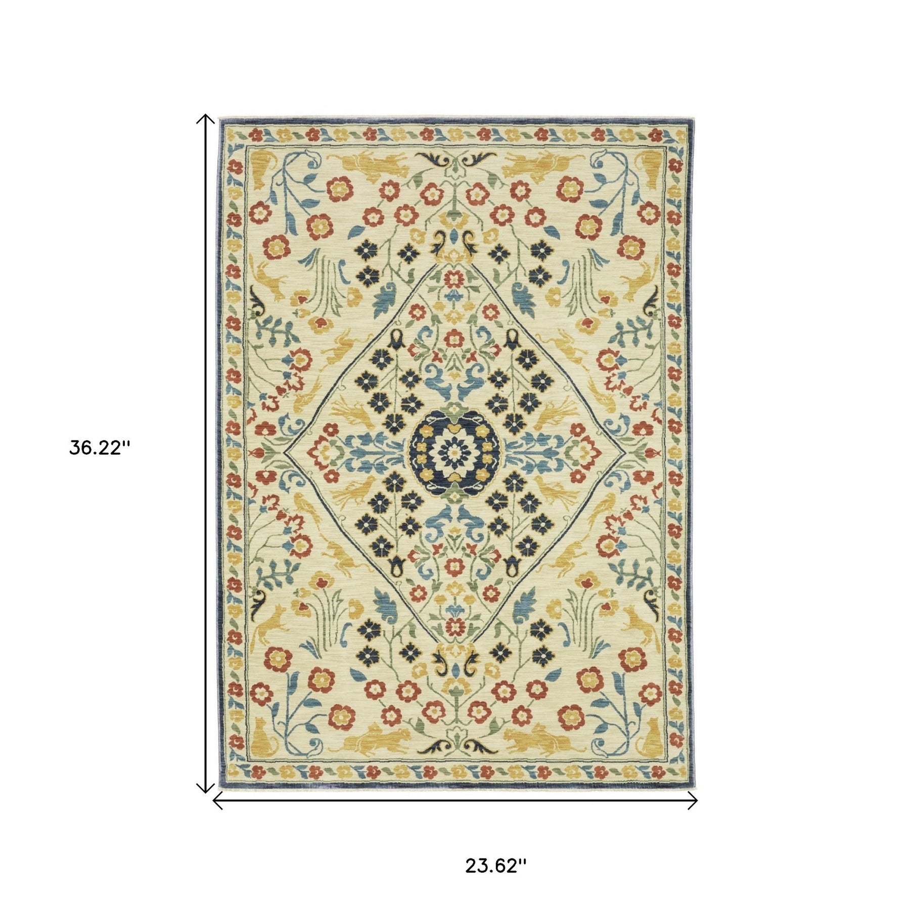 Set an inviting tone in your space with this 2-foot x 3-foot ivory oriental power loom area rug with fringe. This rectangle shaped rug features a oriental design in ivory to give it visual interest. A classic shape marries with good looking design for your space the coloring of this rug adds a delightfully neutral tone to your home and will easily match with most any decor. Ideal for spaces with kids and pets, this rug is stain resistant to help repel stains and spilled liquids. Tassel ends bring a timeless and fashionable look to your interior. Area rugs help to give warmth and sense of home to your space. 23.62-inch H x 36.22-inch W x 0.32-inch D