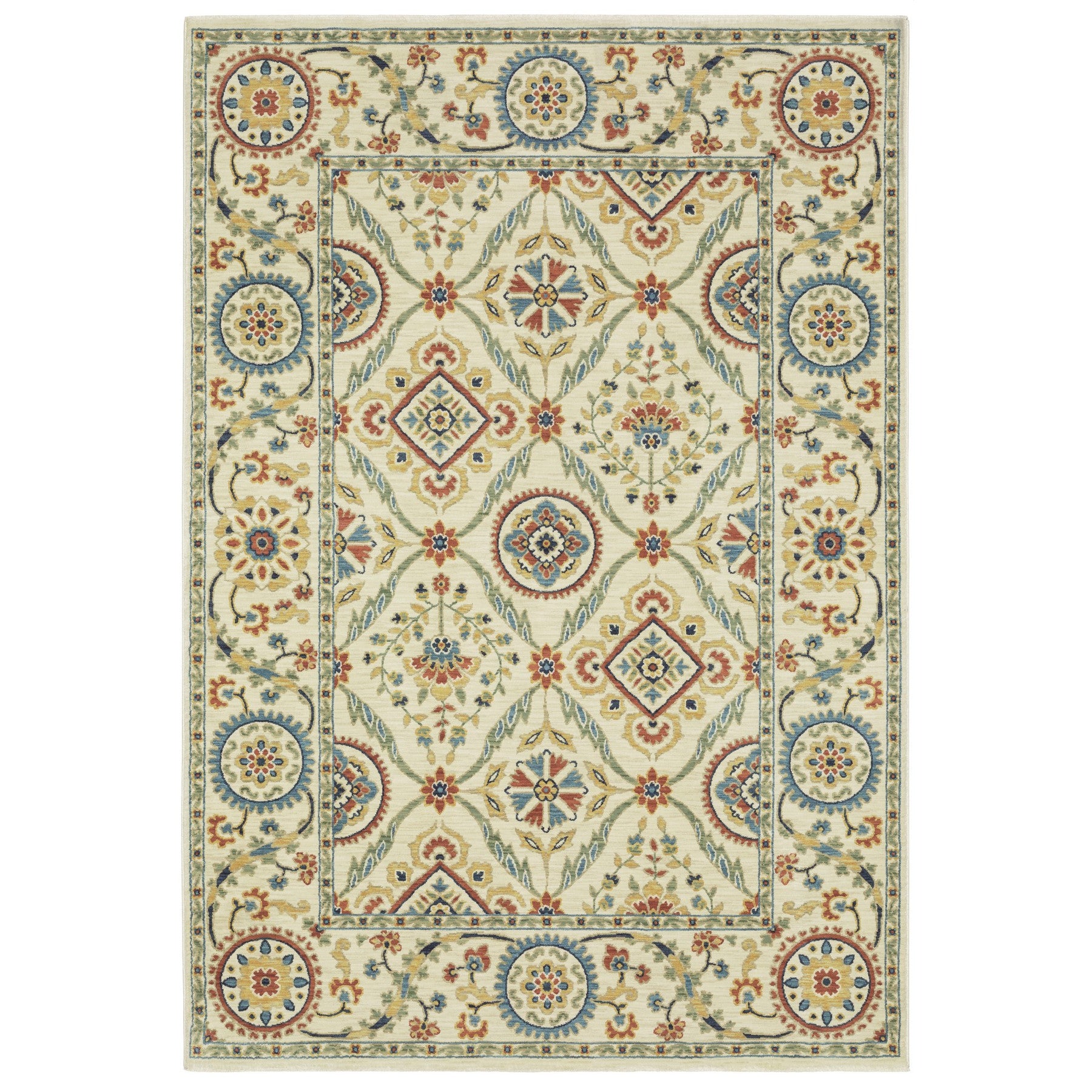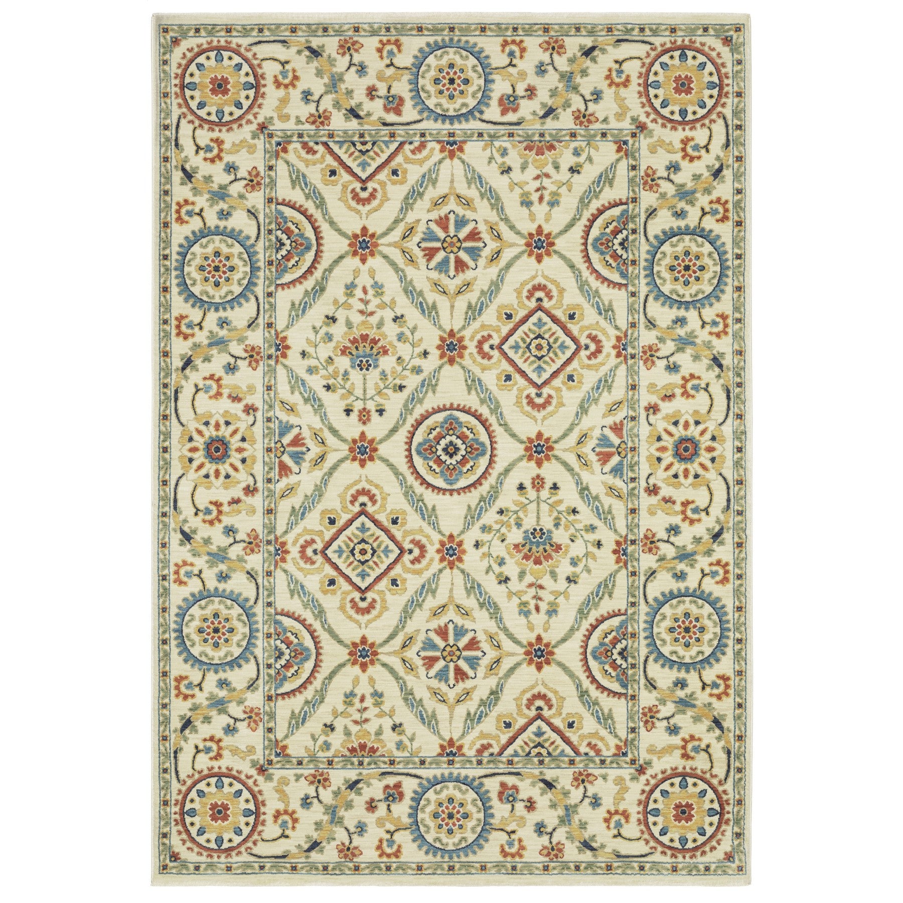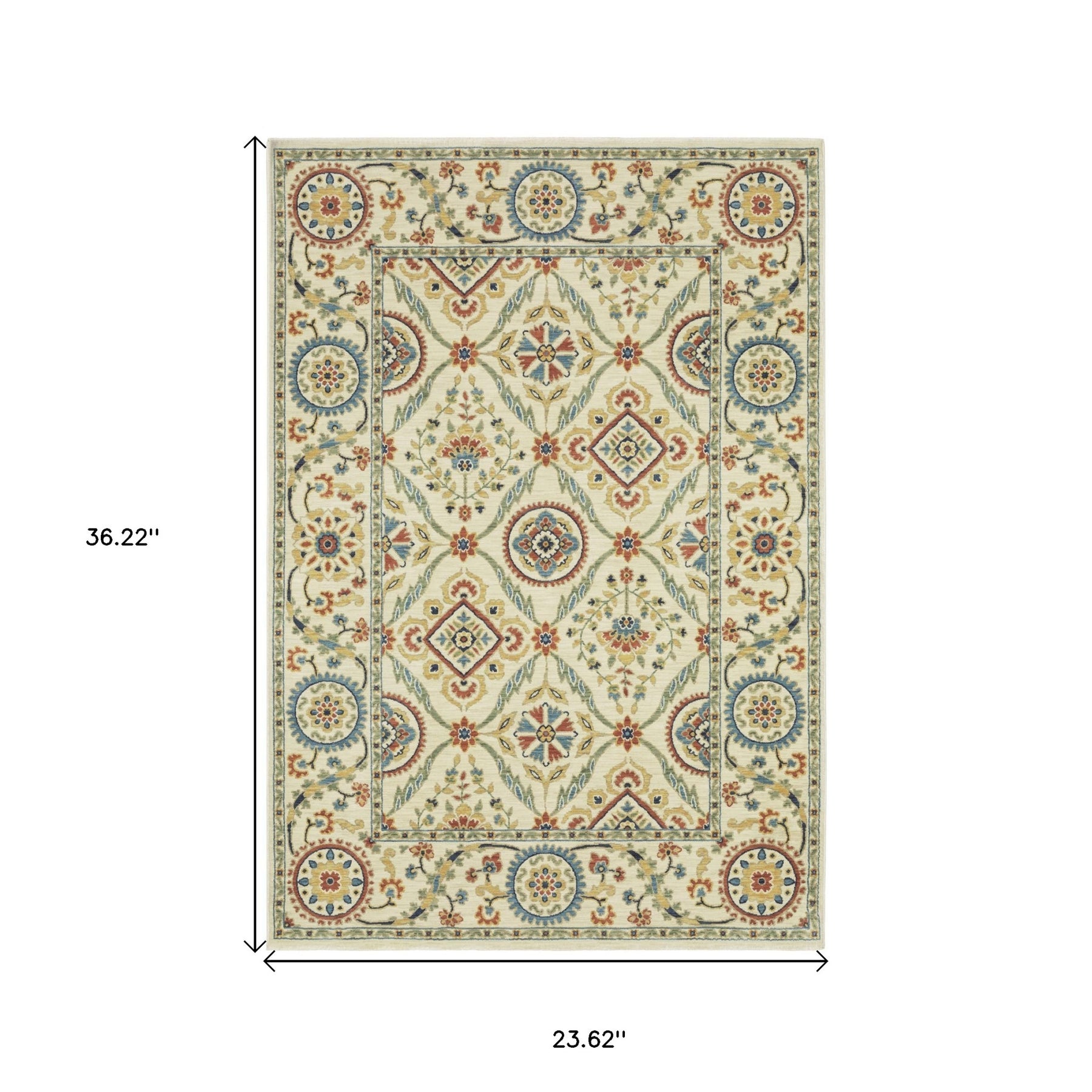 This 2-foot x 3-foot ivory oriental power loom area rug with fringe, is a great way to add warmth to a room. This rectangle shaped rug features a oriental design in ivory to give it visual interest. A classic shape marries with good looking design for your space the coloring of this rug adds a delightfully neutral tone to your home and will easily match with most any decor. Ideal for spaces with kids and pets, this rug is stain resistant to help repel stains and spilled liquids. Tassel ends bring a timeless and fashionable look to your interior. Area rugs help to give warmth and sense of home to your space. 23.62-inch H x 36.22-inch W x 0.32-inch D