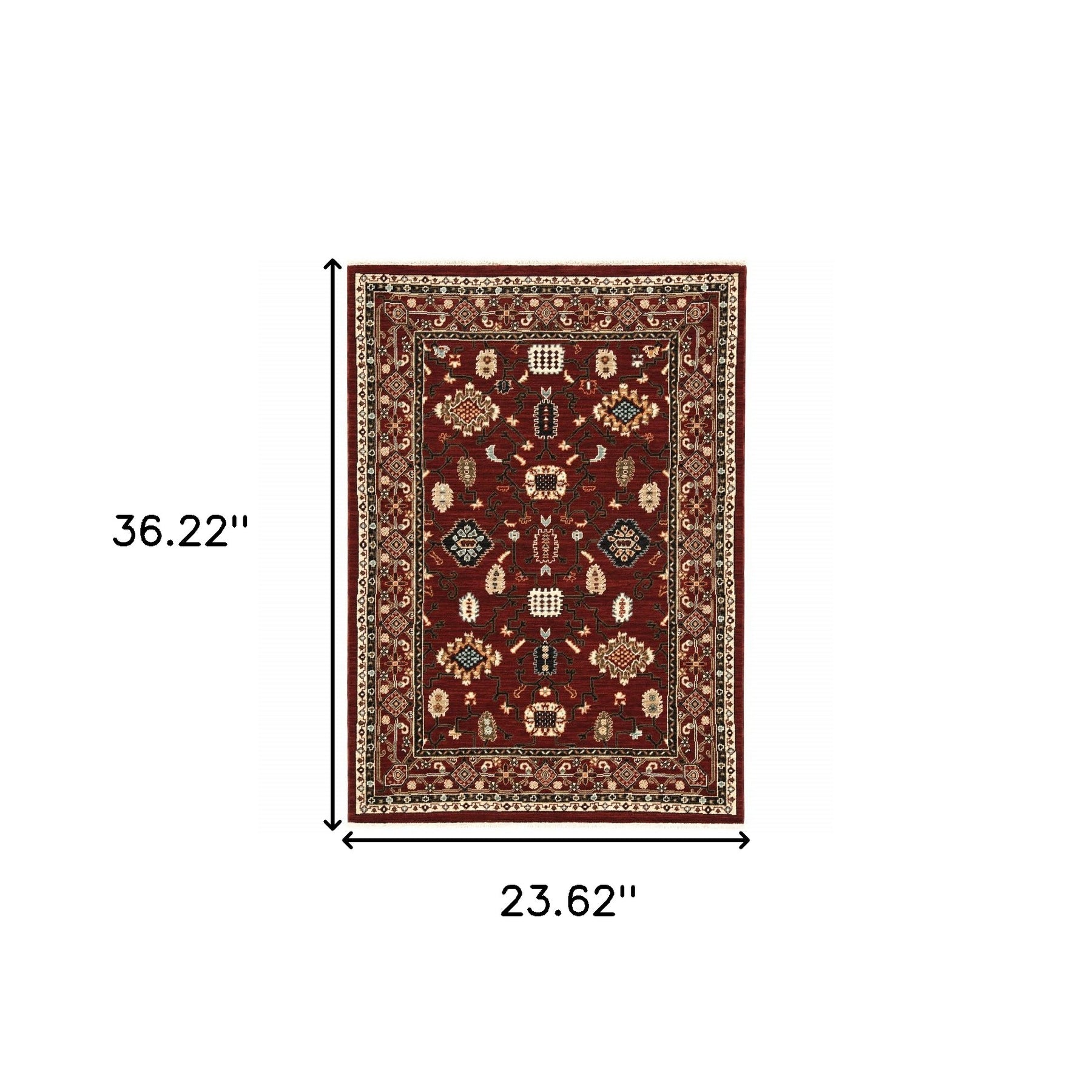 Set an inviting tone in your space with this 2' x 3' red black ivory and brown oriental power loom stain resistant area rug with fringe. This rectangle shaped rug features a oriental design in red black ivory and brown to give it visual interest. A classic shape marries with good looking design for your space Ideal for spaces with kids and pets, this rug is stain resistant to help repel stains and spilled liquids. Tassel ends bring a timeless and fashionable look to your interior. Place this area rug against a hardwood or tile floor and it will enliven your living space with style and sophistication. 0.31" H x 23.62" W x 36.22" D
