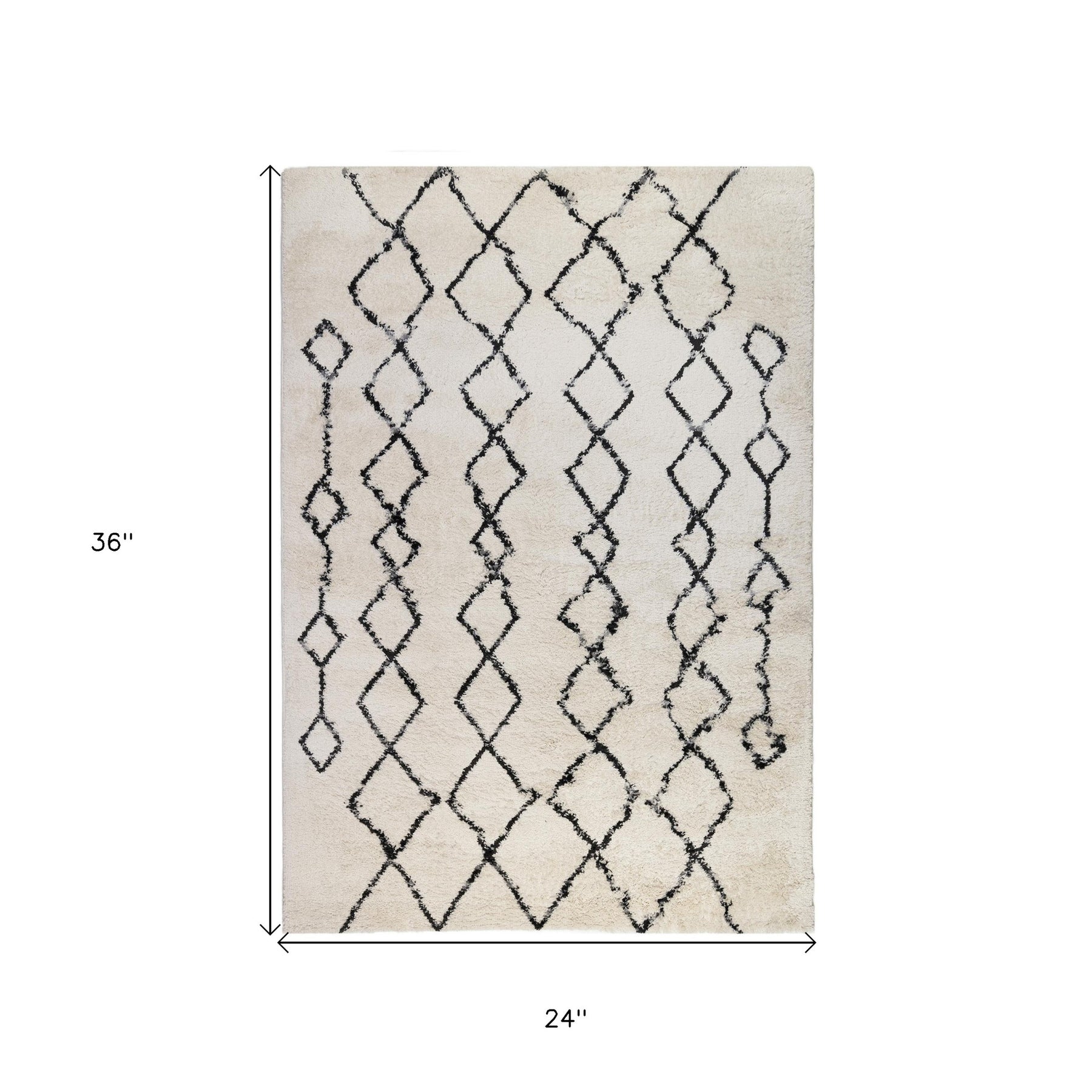 Set an inviting tone in your space with this 2-foot x 3-foot ivory and black geometric shag area rug. This rectangle shaped rug features a geometric design in ivory and black to give it visual interest. A classic shape marries with good looking design for your space ideal for spaces with kids and pets, this rug is stain resistant to help repel stains and spilled liquids. The retro shag construction of this luxurious rug will provide a soft and comfortable barrier to color tile and hardwood floors. Place this area rug against a hardwood or tile floor and it will enliven your living space with style and sophistication. 24-inch H x 36-inch W x 1.8-inch D
