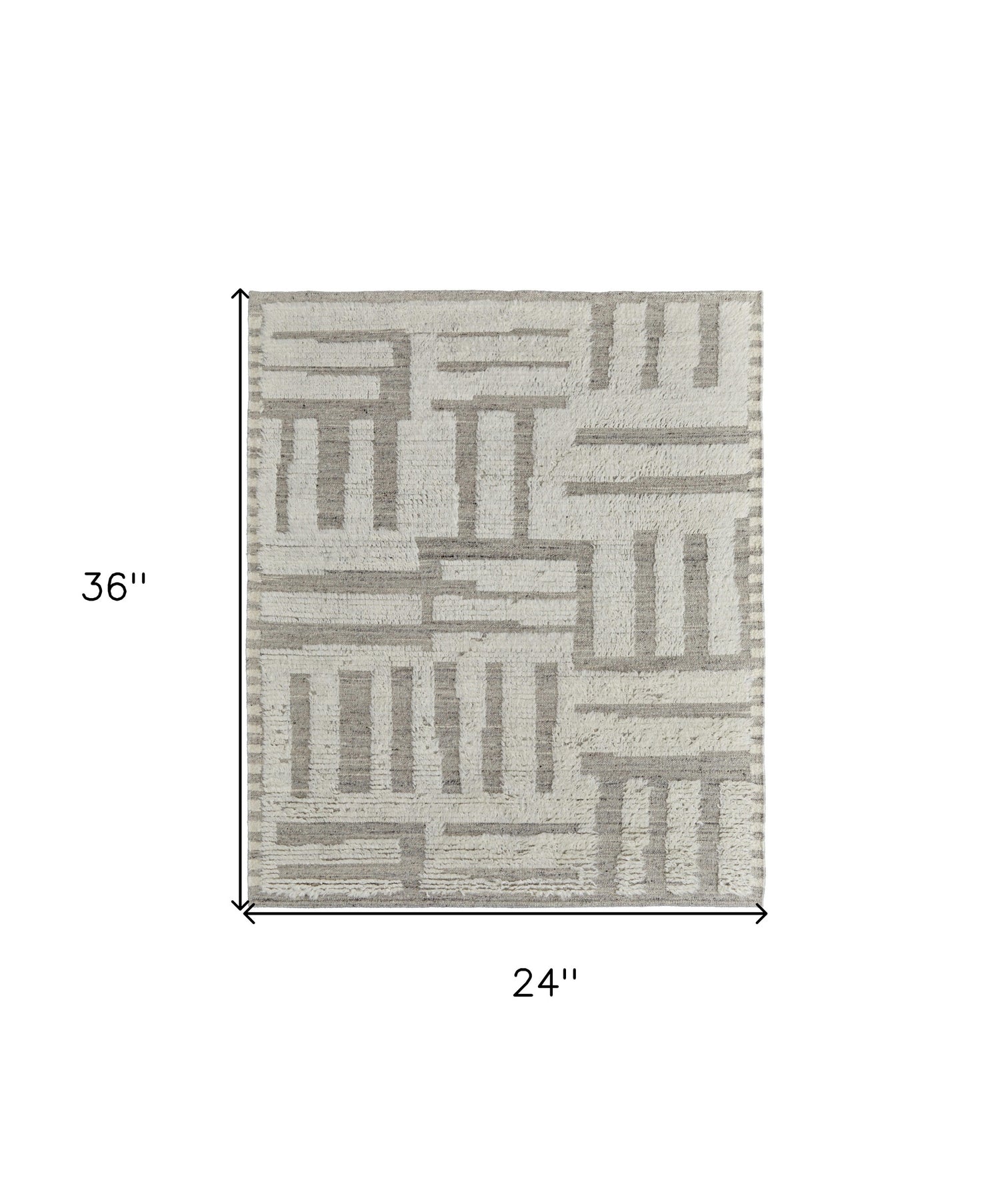 Add some artistry to your room with this 2-foot x 3-foot gray and ivory wool geometric hand woven area rug. This rectangle shaped rug features a geometric design in gray and ivory to give it visual interest. A classic shape marries with good looking design for your space ideal for spaces with kids and pets, this rug is stain resistant to help repel stains and spilled liquids. Crafted by skilled artisans, this hand woven rug is genuine and unique. No two will be exactly alike. Area rugs help to give warmth and sense of home to your space. 24-inch H x 36-inch W x 0.71-inch D
