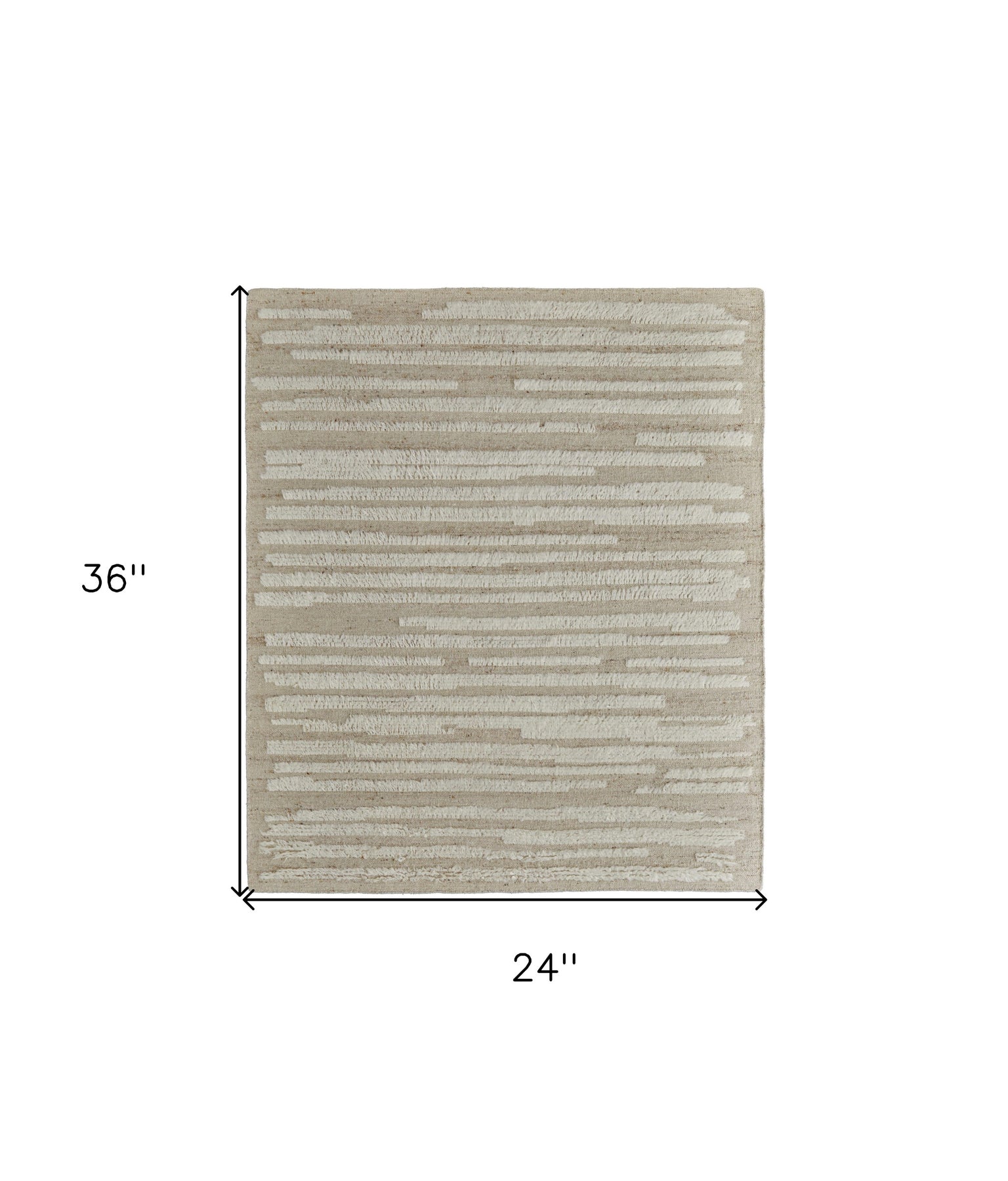 Add great coloration and comfortable texture to your space with this 2-foot x 3-foot white and tan wool striped hand woven area rug. This rectangle shaped rug features a striped design in white and tan to give it visual interest. A classic shape marries with good looking design for your space ideal for spaces with kids and pets, this rug is stain resistant to help repel stains and spilled liquids. Crafted by skilled artisans, this hand woven rug is genuine and unique. No two will be exactly alike. Place this area rug against a hardwood or tile floor and it will enliven your living space with style and sophistication. 24-inch H x 36-inch W x 0.71-inch D