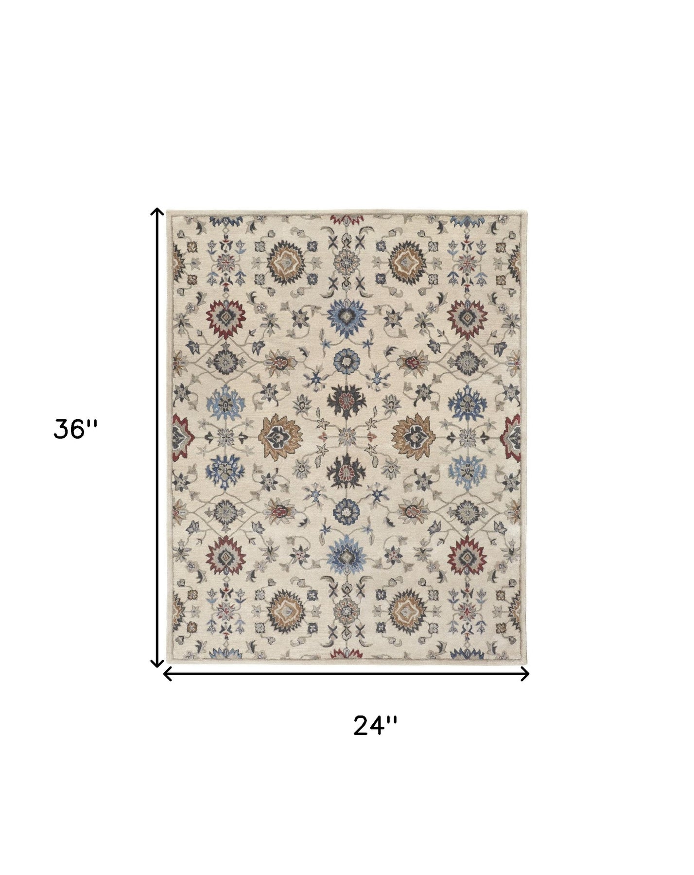 Add some artistry to your room with this 2-foot x 3-foot ivory and blue wool floral hand tufted area rug. This rectangle shaped rug features a floral design in ivory and blue to give it visual interest. A classic shape marries with good looking design for your space ideal for spaces with kids and pets, this rug is stain resistant to help repel stains and spilled liquids. Place this area rug against a hardwood or tile floor and it will enliven your living space with style and sophistication. 24-inch H x 36-inch W x 0.68-inch D