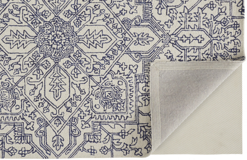 This 2' x 3' ivory and navy wool floral tufted handmade stain resistant area rug, is a great way to add warmth to a room. This rectangle shaped rug features a floral design in ivory and navy to give it visual interest. A classic shape marries with good looking design for your space Ideal for spaces with kids and pets, this rug is stain resistant to help repel stains and spilled liquids. Place this area rug against a hardwood or tile floor and it will enliven your living space with style and sophistication. 0.5" H x 24" W x 36" D