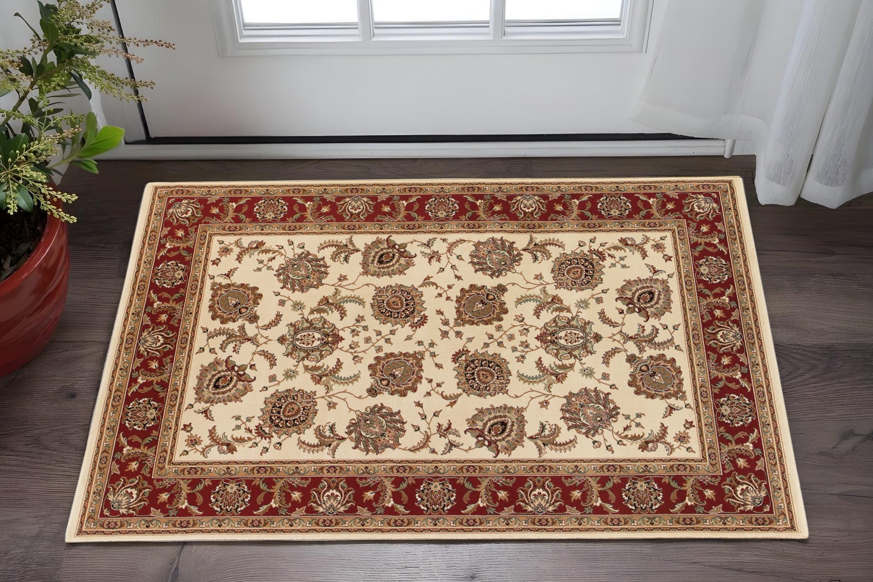 Add great coloration and comfortable texture to your space with this 2-foot x 3-foot ivory and red oriental area rug. Ideal for spaces with kids and pets, this rug is stain resistant to help repel dirt and spilled liquids. Built to last, this rug crafted from polypropylene fibers is known for its durability and long lasting appeal. Rugs are a great way to showcase your style, hide imperfections, warm your home and reduce noise. This smaller sized, traditional styled rug is just what you need for your walkway, bedside, in front of door, cabinet, refrigerator, or chair. 24-inch h x 36-inch w x 0.43-inch d.
