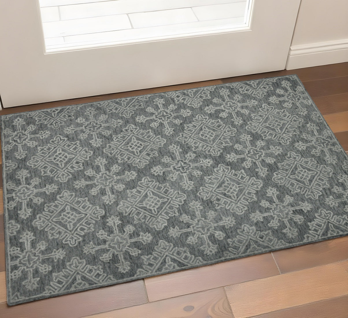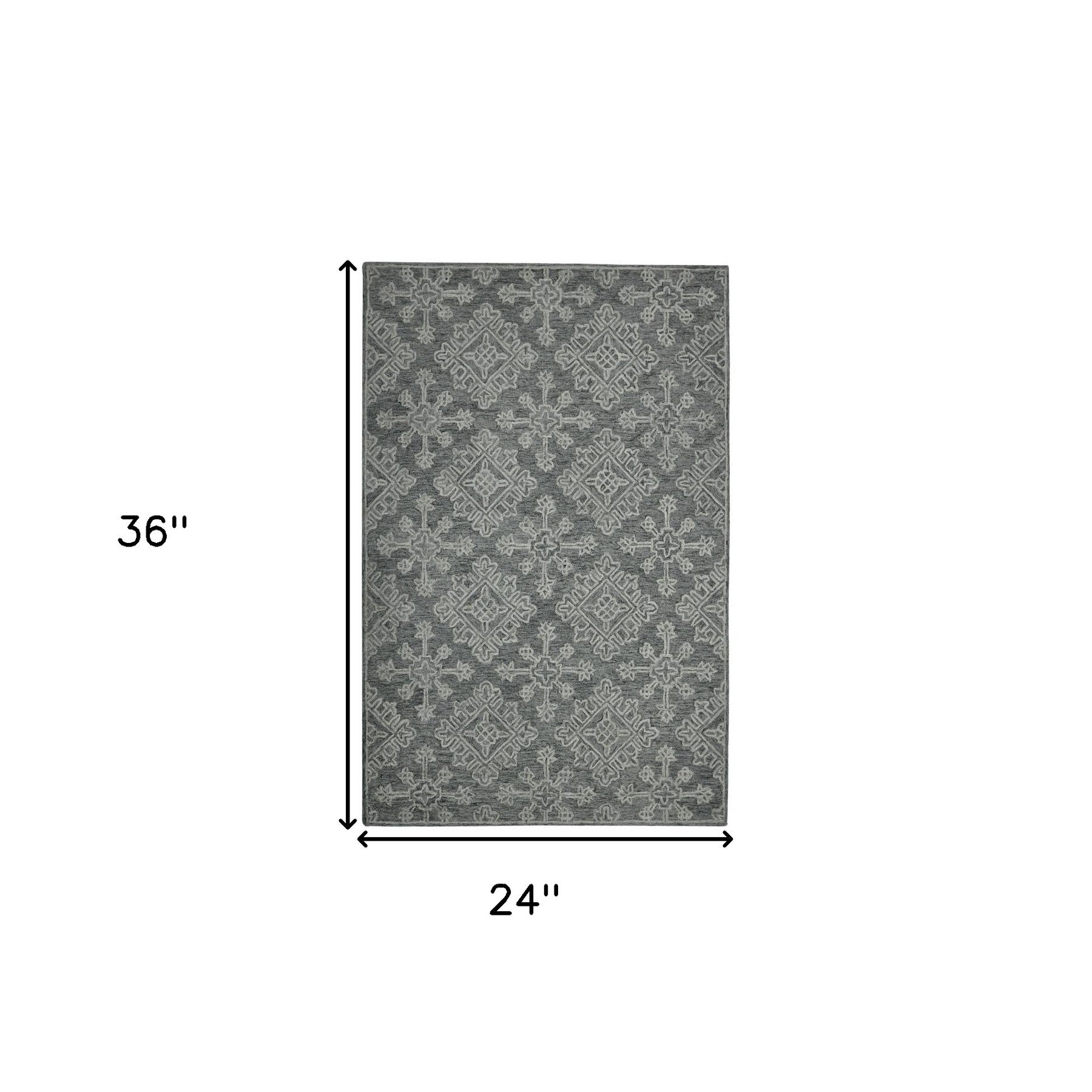This 2-foot x 3-foot graphite and gray wool oriental hand hooked area rug, is a great way to add warmth to a room. Crafted by skilled artisans, this hand hooked rug is genuine and unique. No two will be exactly alike. Rugs are a great way to showcase your style, hide imperfections, warm your home and reduce noise. This smaller sized, transitional styled rug is just what you need for your walkway, bedside, in front of door, cabinet, refrigerator, or chair. 24-inch h x 36-inch w x 0.4-inch d.