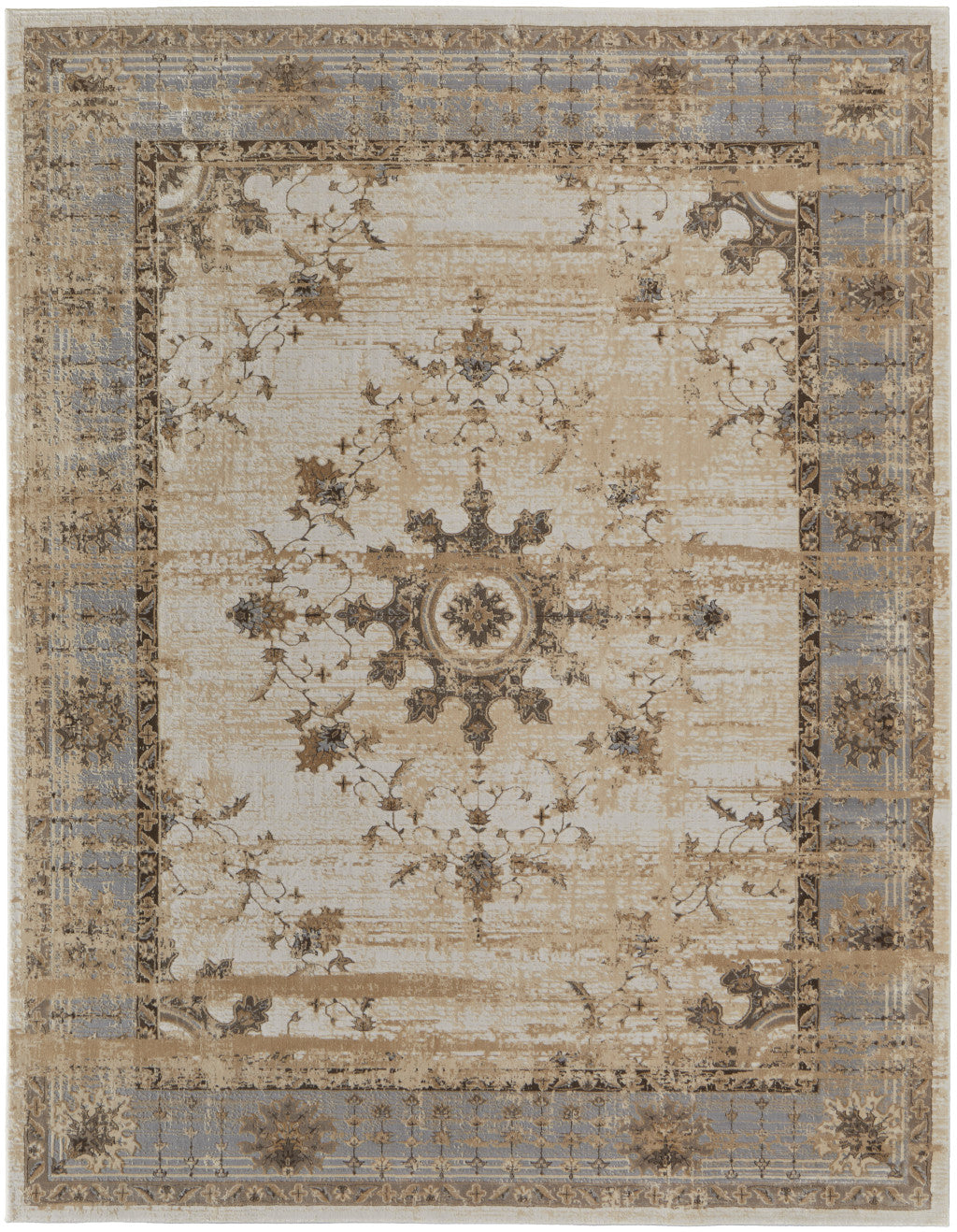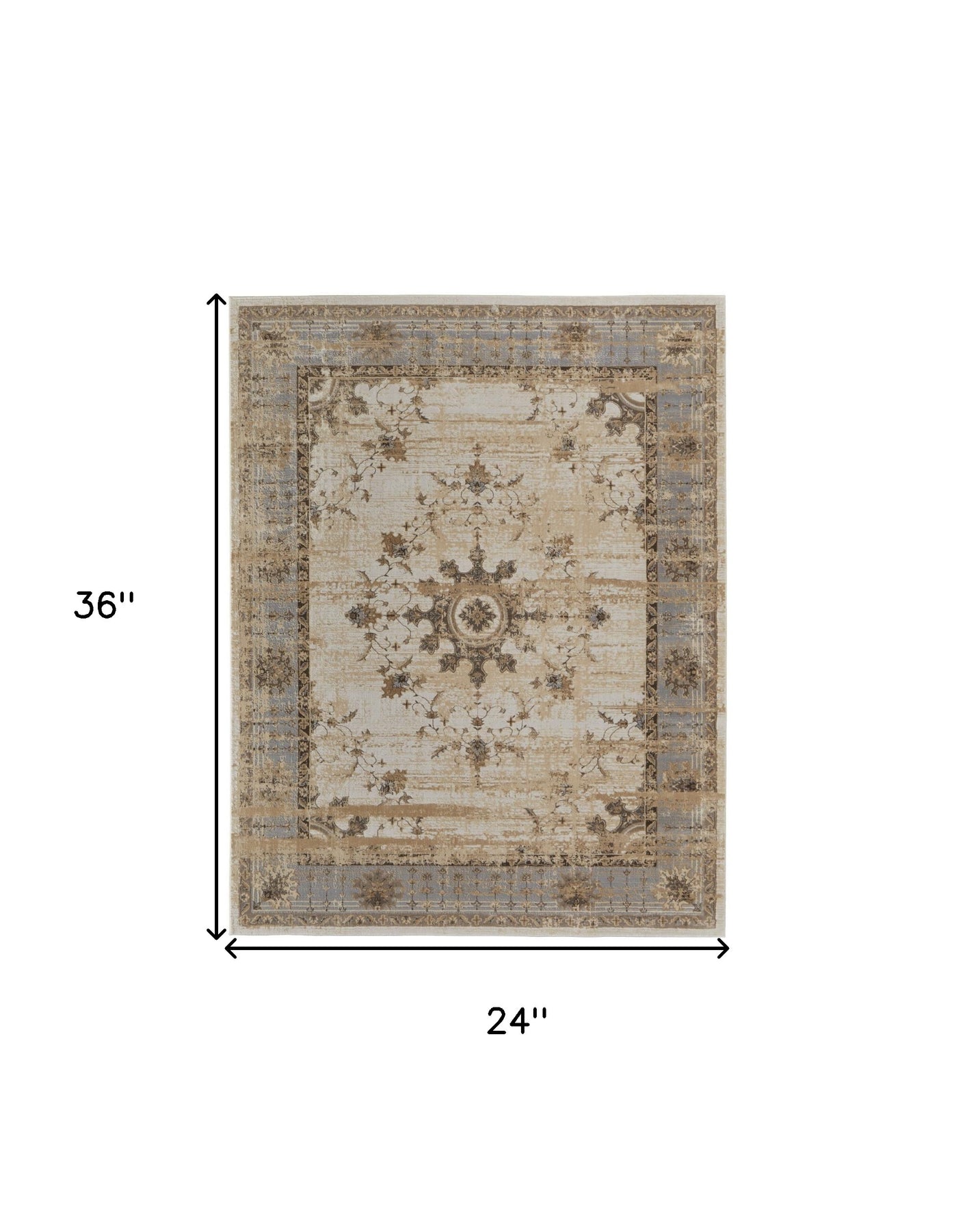 Add some artistry to your room with this 2' x 3' tan brown and gray power loom distressed area rug. This superior Turkish rug represents the highest quality and is built to last. Place this area rug against a hardwood or tile floor and it will enliven your living space with style and sophistication. 0.39" H x 24" W x 36" D