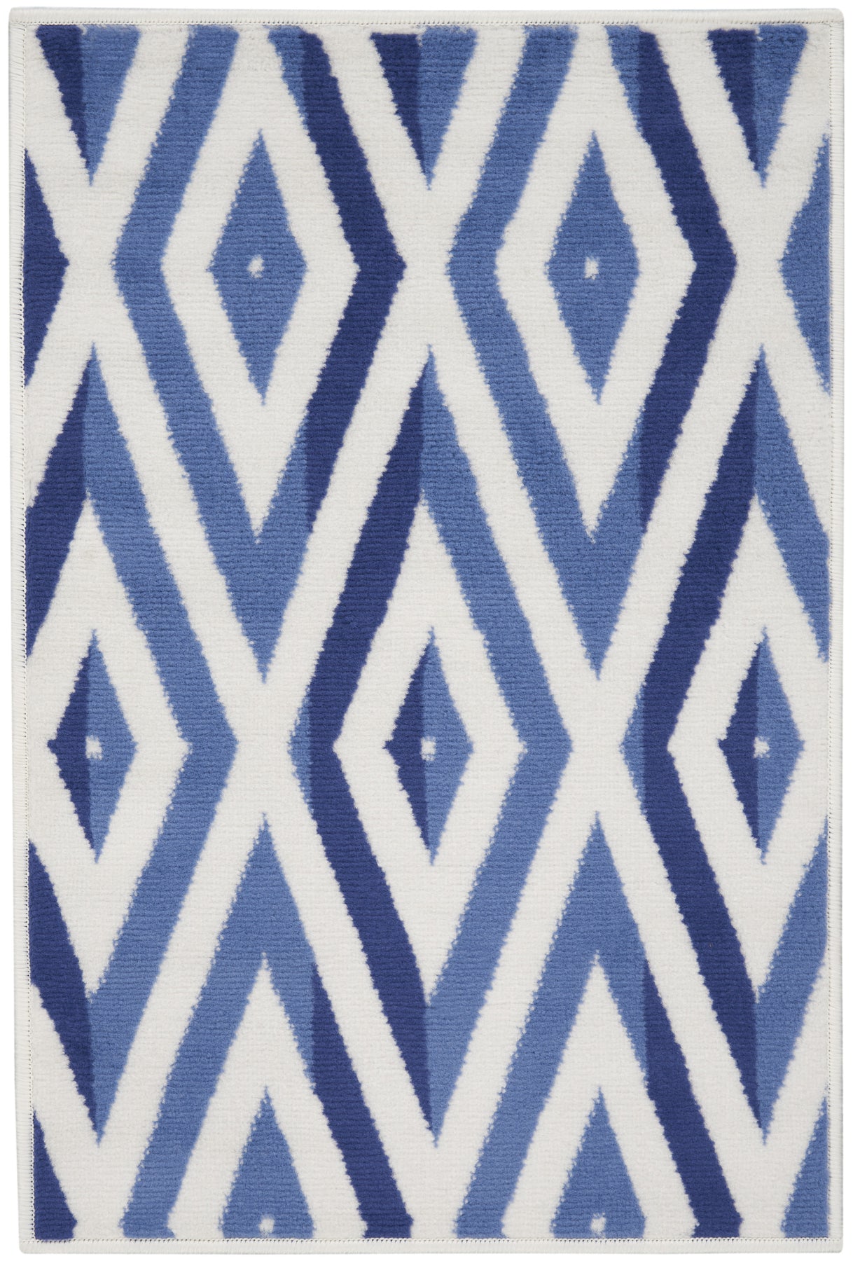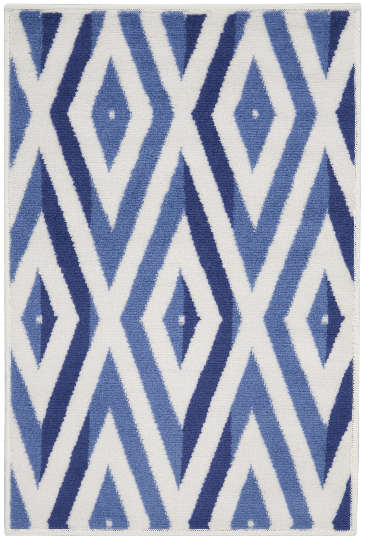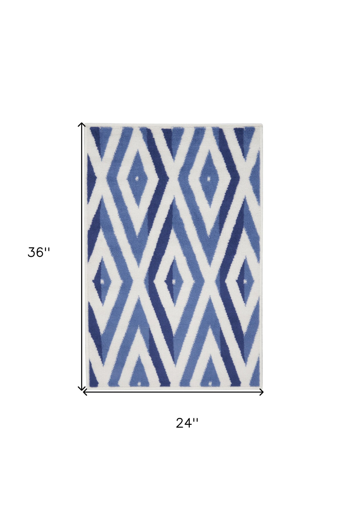 Add some artistry to your room with this 2-foot x 3-foot ivory and blue geometric area rug. Ideal for spaces with kids and pets, this rug is stain resistant to help repel dirt and spilled liquids. Built to last, this rug crafted from polypropylene fibers is known for its durability and long lasting appeal. Rugs are a great way to showcase your style, hide imperfections, warm your home and reduce noise. This smaller sized, modern styled rug is just what you need for your walkway, bedside, in front of door, cabinet, refrigerator, or chair. 24-inch h x 36-inch w x 0.39-inch d.