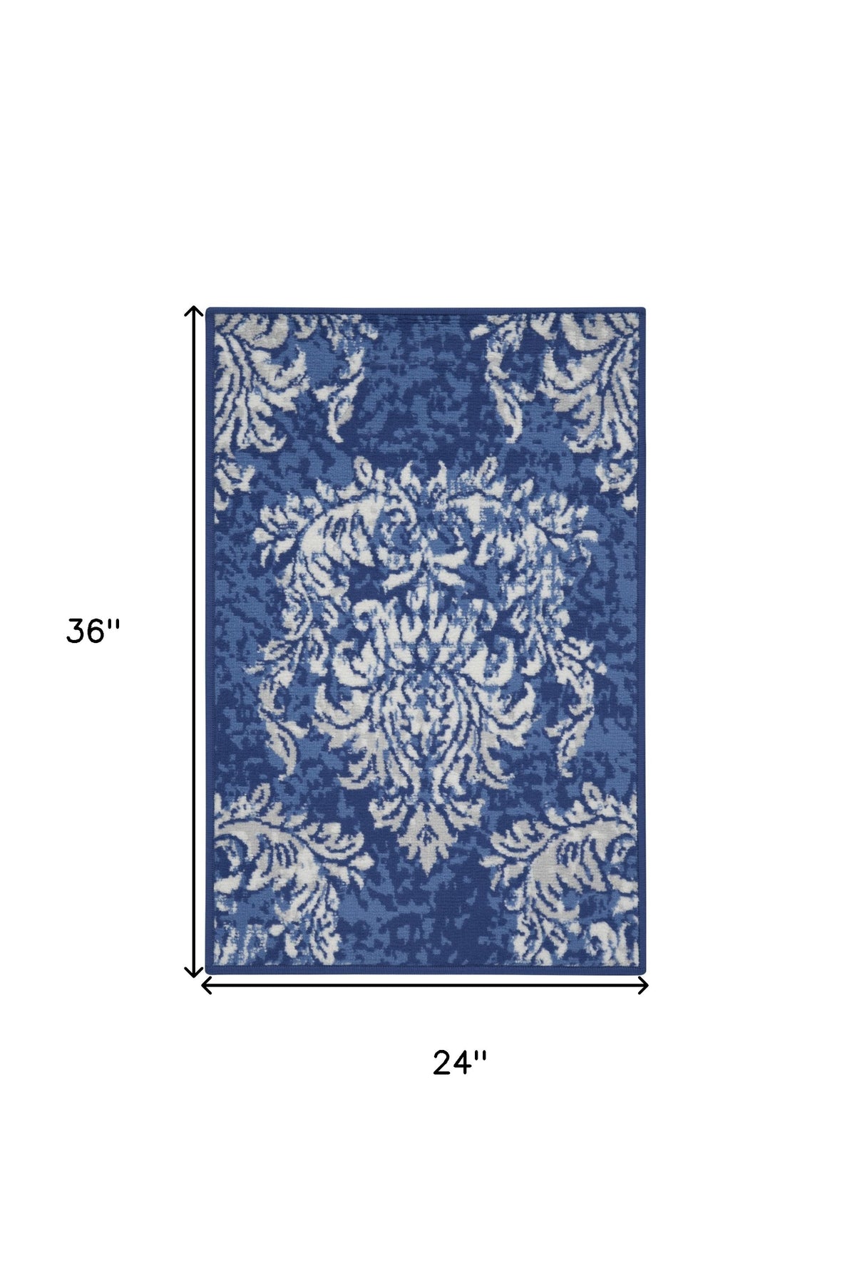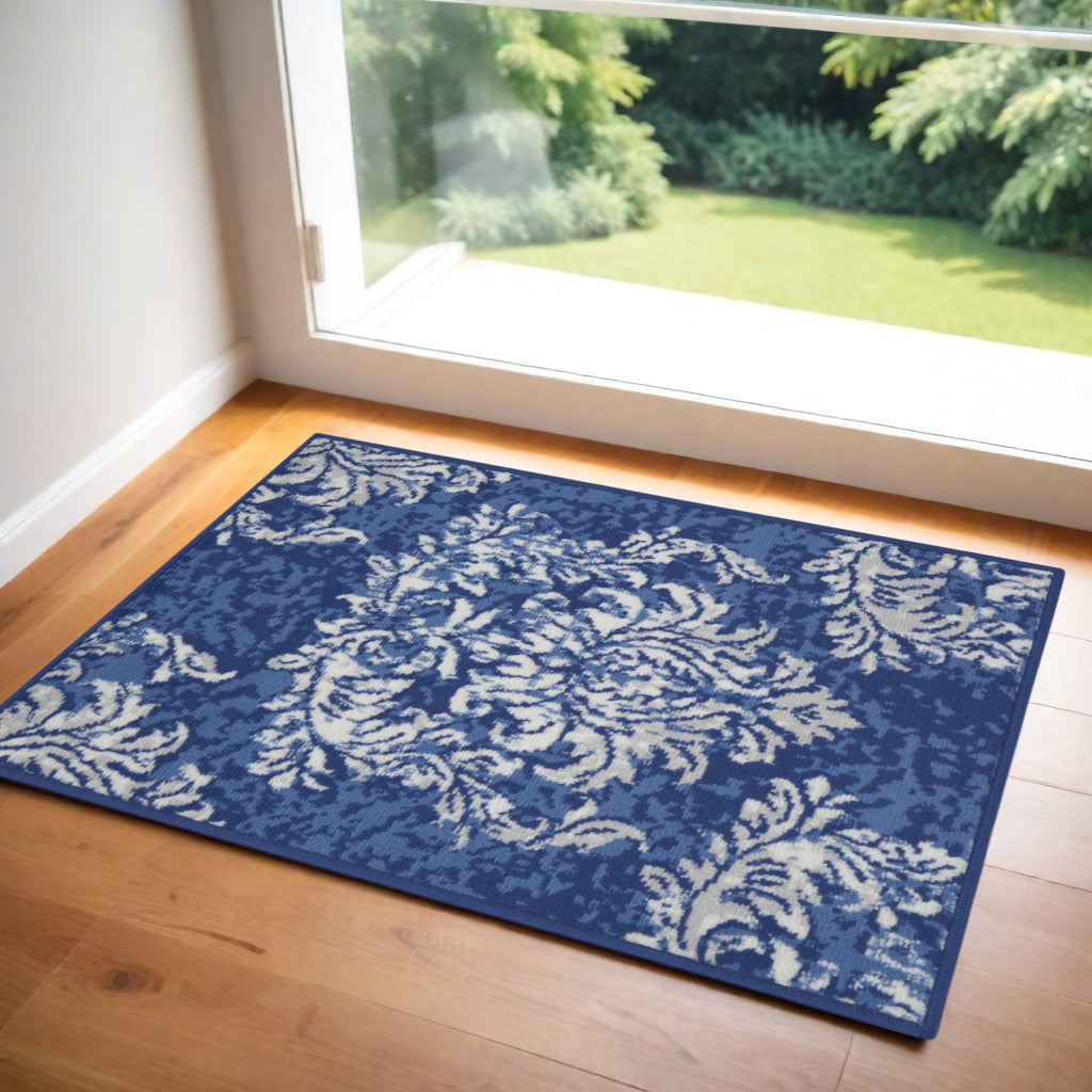 Set an inviting tone in your space with this 2-foot x 3-foot navy blue and ivory damask distressed area rug. Ideal for spaces with kids and pets, this rug is stain resistant to help repel dirt and spilled liquids. Built to last, this rug crafted from polypropylene fibers is known for its durability and long lasting appeal. Rugs are a great way to showcase your style, hide imperfections, warm your home and reduce noise. This smaller sized, cottage styled rug is just what you need for your walkway, bedside, in front of door, cabinet, refrigerator, or chair. 24-inch h x 36-inch w x 0.39-inch d.