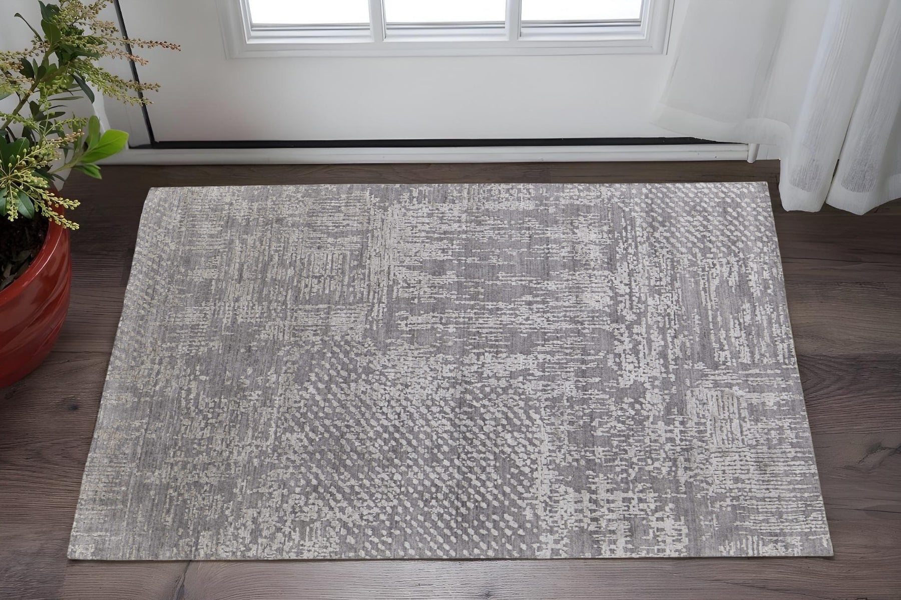 Add some artistry to your room with this 2-foot x 3-foot gray and silver abstract hand woven worn faded area rug. This rectangle shaped rug features a abstract design in gray and silver to give it visual interest. A classic shape marries with good looking design for your space crafted by skilled artisans, this hand woven rug is genuine and unique. No two will be exactly alike. Place this area rug against a hardwood or tile floor and it will enliven your living space with style and sophistication. 24-inch H x 36-inch W x 0.39-inch D