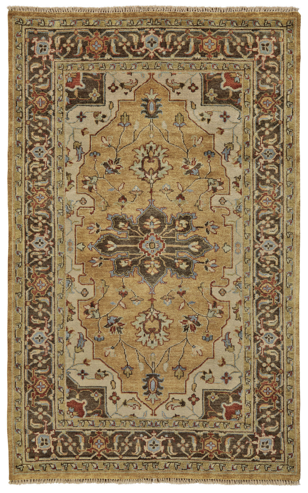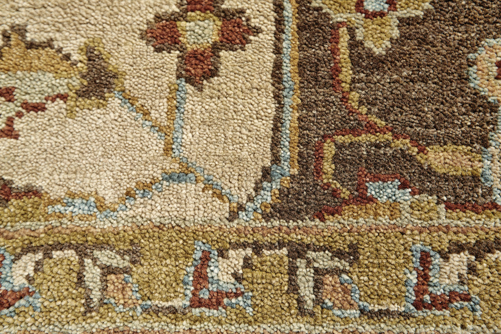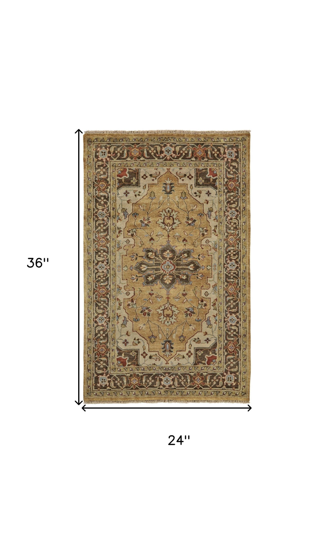 Add great coloration and comfortable texture to your space with this 2-foot x 3-foot tan brown and gold wool oriental hand knotted area rug. Crafted by skilled artisans, this hand knotted rug is genuine and unique. No two will be exactly alike. This rectangle shaped rug features a oriental design that will add a functional and decorative accent to your space. Ideal for spaces with kids and pets, this rug is stain resistant to help repel dirt and spilled liquids. This smaller sized rug is just what you need for your walkway, or in front of door, cabinet, refrigerator, or chair. 24-inch h x 36-inch w x 0.39-inch d