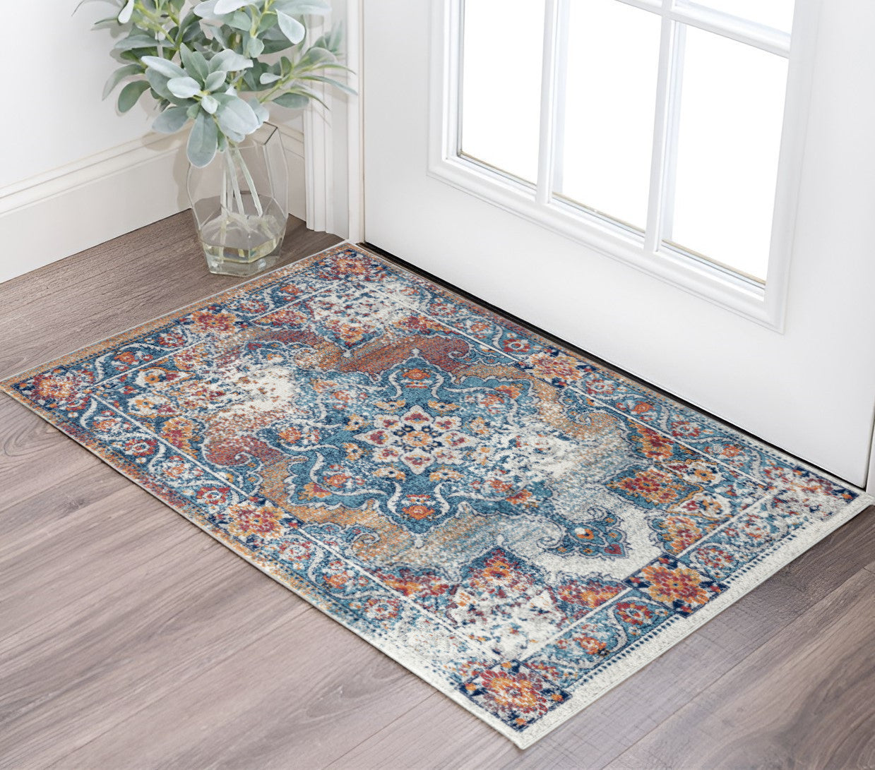 This 2-foot x 3-foot blue red and orange medallion power loom area rug, is a great way to add warmth to a room. This rectangle shaped rug features a medallion design in blue red and orange to give it visual interest. A classic shape marries with good looking design for your space ideal for spaces with kids and pets, this rug is stain resistant to help repel stains and spilled liquids. Area rugs help to give warmth and sense of home to your space. 24-inch H x 36-inch W x 0.38-inch D