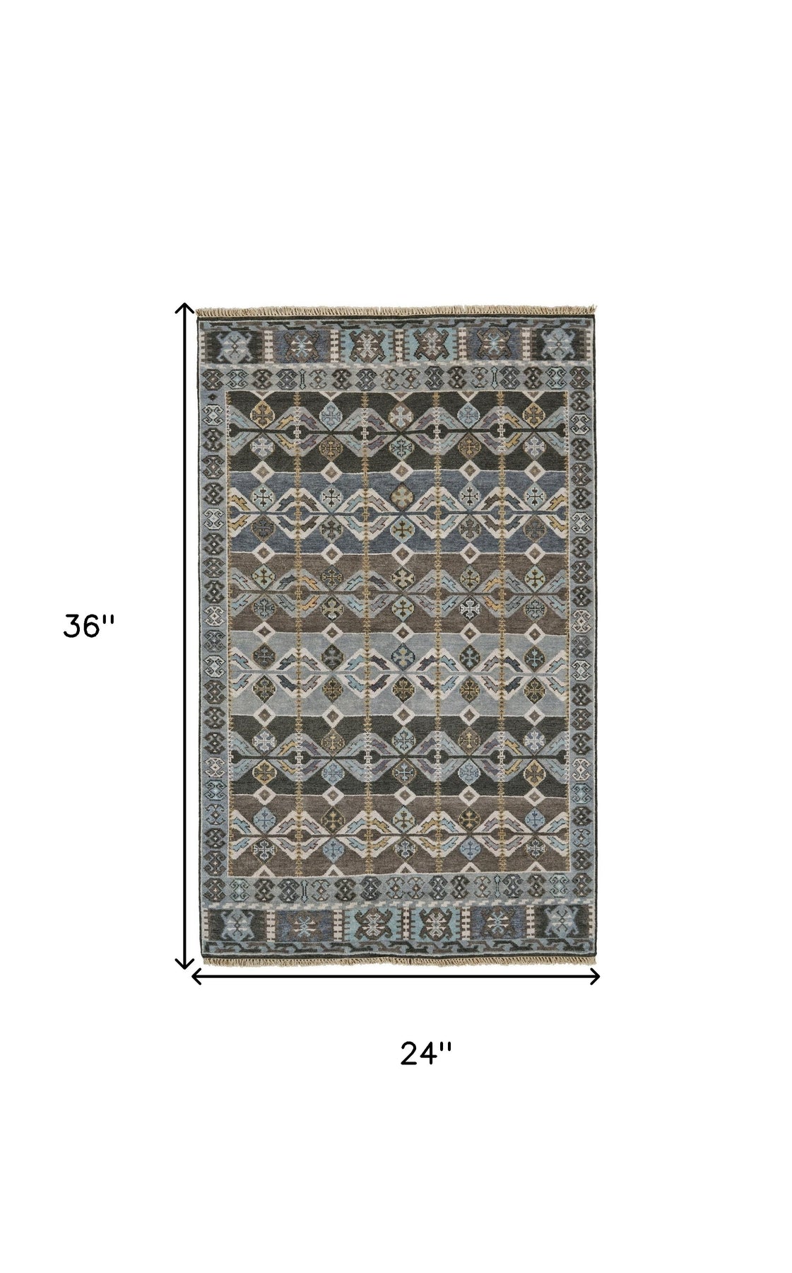 Add great coloration and comfortable texture to your space with this 2-foot x 3-foot blue brown and gray wool southwestern hand knotted area rug. Crafted by skilled artisans, this hand knotted rug is genuine and unique. No two will be exactly alike. This rectangle shaped rug features a southwestern design that will add a functional and decorative accent to your space. Ideal for spaces with kids and pets, this rug is stain resistant to help repel dirt and spilled liquids. This smaller sized rug is just what you need for your walkway, or in front of door, cabinet, refrigerator, or chair. 24-inch h x 36-inch w x 0.37-inch d