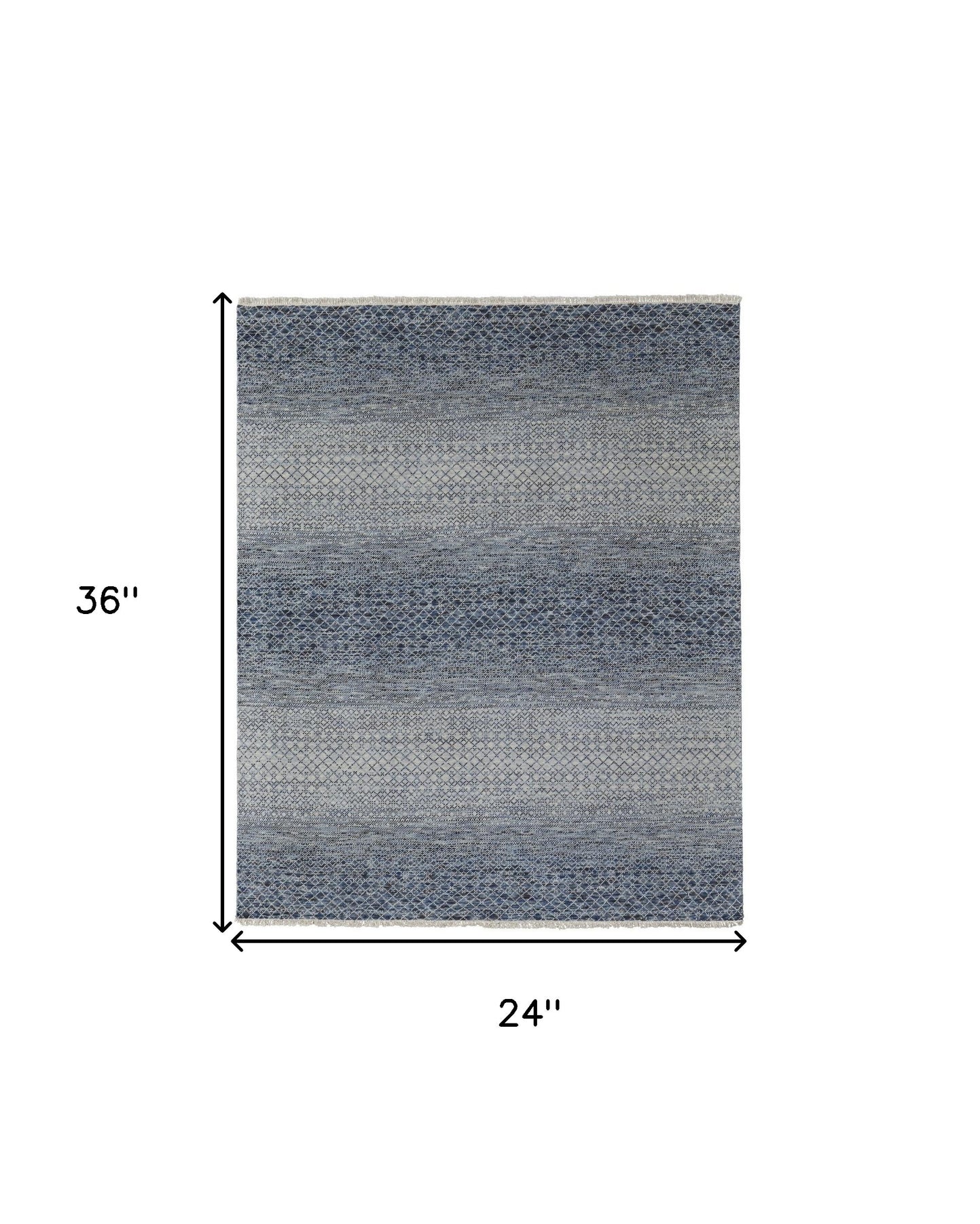 Set an inviting tone in your space with this 2-foot x 3-foot ivory gray and blue wool hand knotted area rug with fringe. This rectangle shaped rug flaunts a ivory gray and blue color that will be a great way to accent your space. Solid colors are versatile and will blend with any existing decor style. Ideal for spaces with kids and pets, this rug is stain resistant to help repel stains and spilled liquids. Tassel ends bring a timeless and fashionable look to your interior. Crafted by skilled artisans, this hand knotted rug is genuine and unique. No two will be exactly alike. Place this area rug against a hardwood or tile floor and it will enliven your living space with style and sophistication. 24-inch H x 36-inch W x 0.35-inch D
