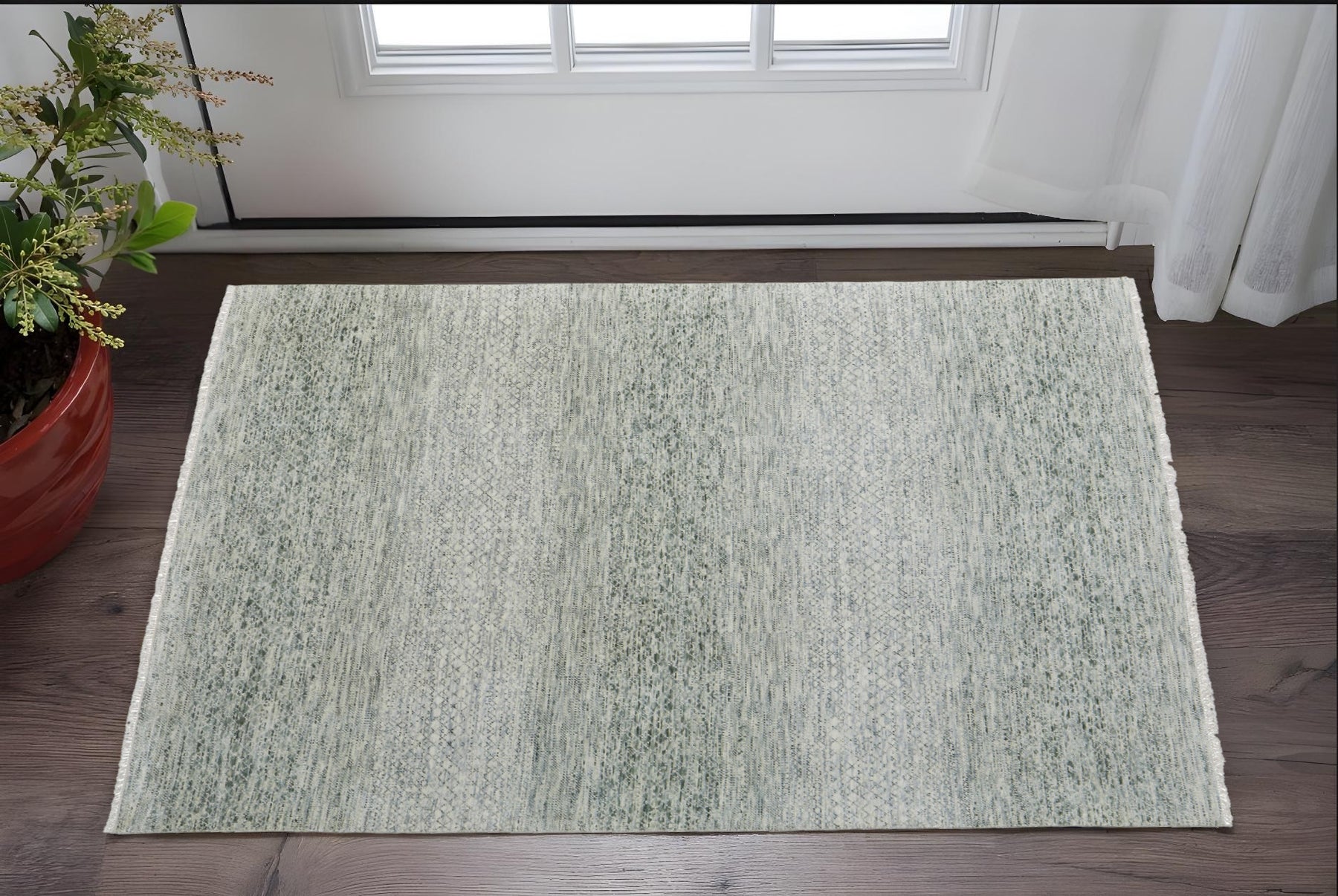 Add some artistry to your room with this 2-foot x 3-foot ivory and green wool hand knotted area rug with fringe. This rectangle shaped rug flaunts a ivory and green color that will be a great way to accent your space. Solid colors are versatile and will blend with any existing decor style. Ideal for spaces with kids and pets, this rug is stain resistant to help repel stains and spilled liquids. Tassel ends bring a timeless and fashionable look to your interior. Crafted by skilled artisans, this hand knotted rug is genuine and unique. No two will be exactly alike. Place this area rug against a hardwood or tile floor and it will enliven your living space with style and sophistication. 24-inch H x 36-inch W x 0.35-inch D