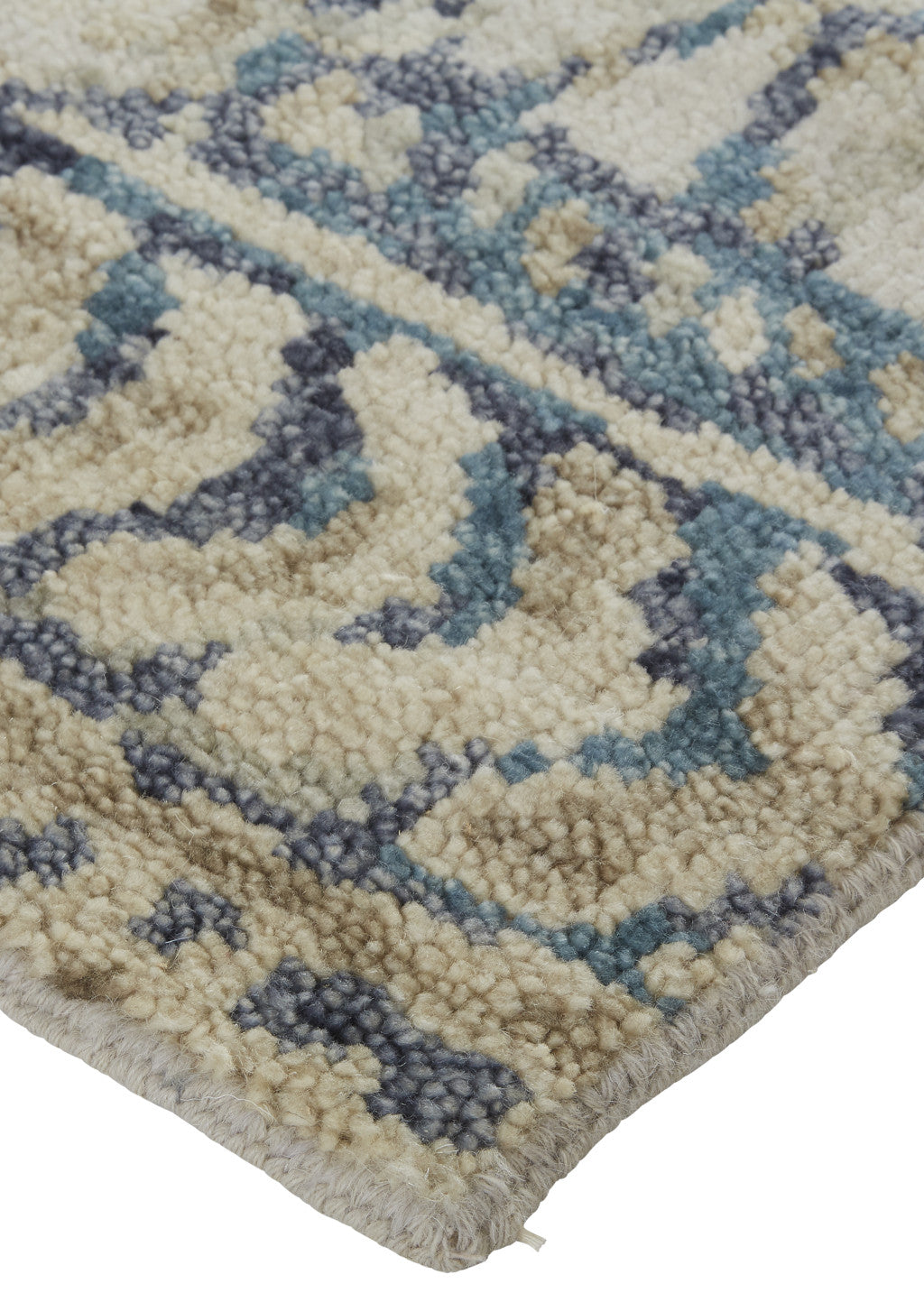 This 2-foot x 3-foot ivory and blue wool geometric hand knotted area rug, is a great way to add warmth to a room. Crafted by skilled artisans, this hand knotted rug is genuine and unique. No two will be exactly alike. This rectangle shaped rug features a geometric design that will add a functional and decorative accent to your space. Ideal for spaces with kids and pets, this rug is stain resistant to help repel dirt and spilled liquids. This smaller sized rug is just what you need for your walkway, or in front of door, cabinet, refrigerator, or chair. 24-inch h x 36-inch w x 0.28-inch d