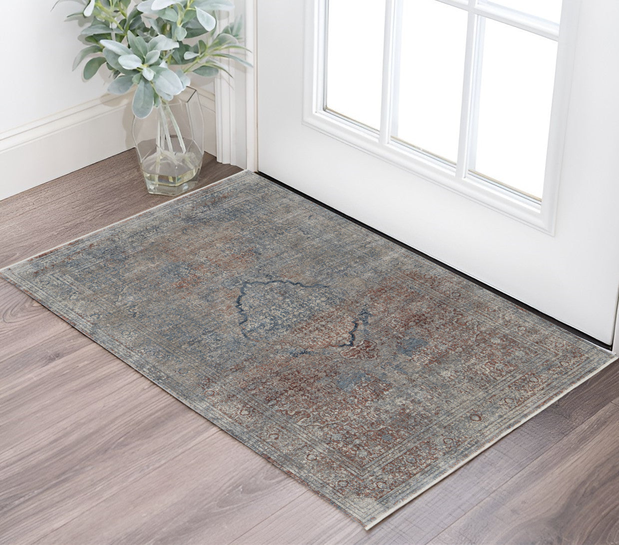 Add some artistry to your room with this 2-foot x 3-foot blue and gray floral power loom area rug. This rectangle shaped rug features a floral design in blue and gray to give it visual interest. A classic shape marries with good looking design for your space ideal for spaces with kids and pets, this rug is stain resistant to help repel stains and spilled liquids. 24-inch H x 36-inch W x 0.25-inch D