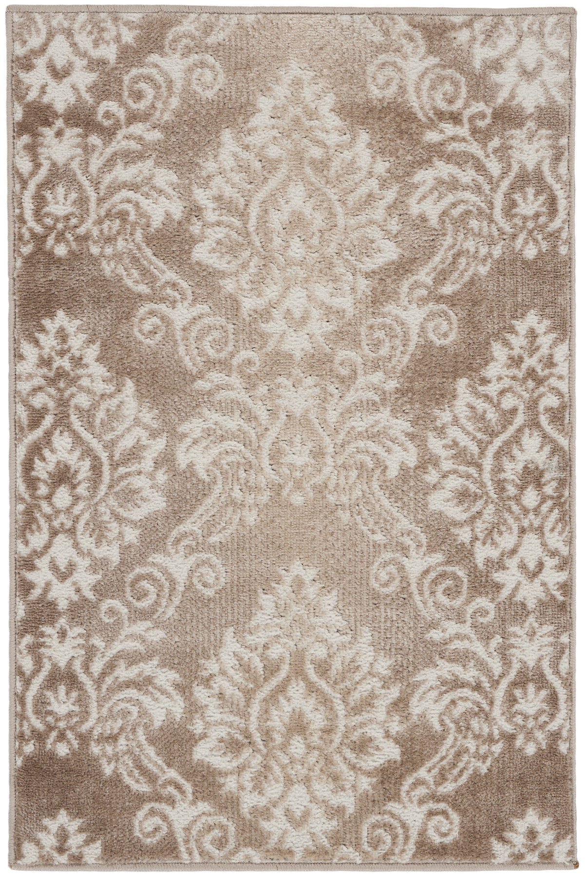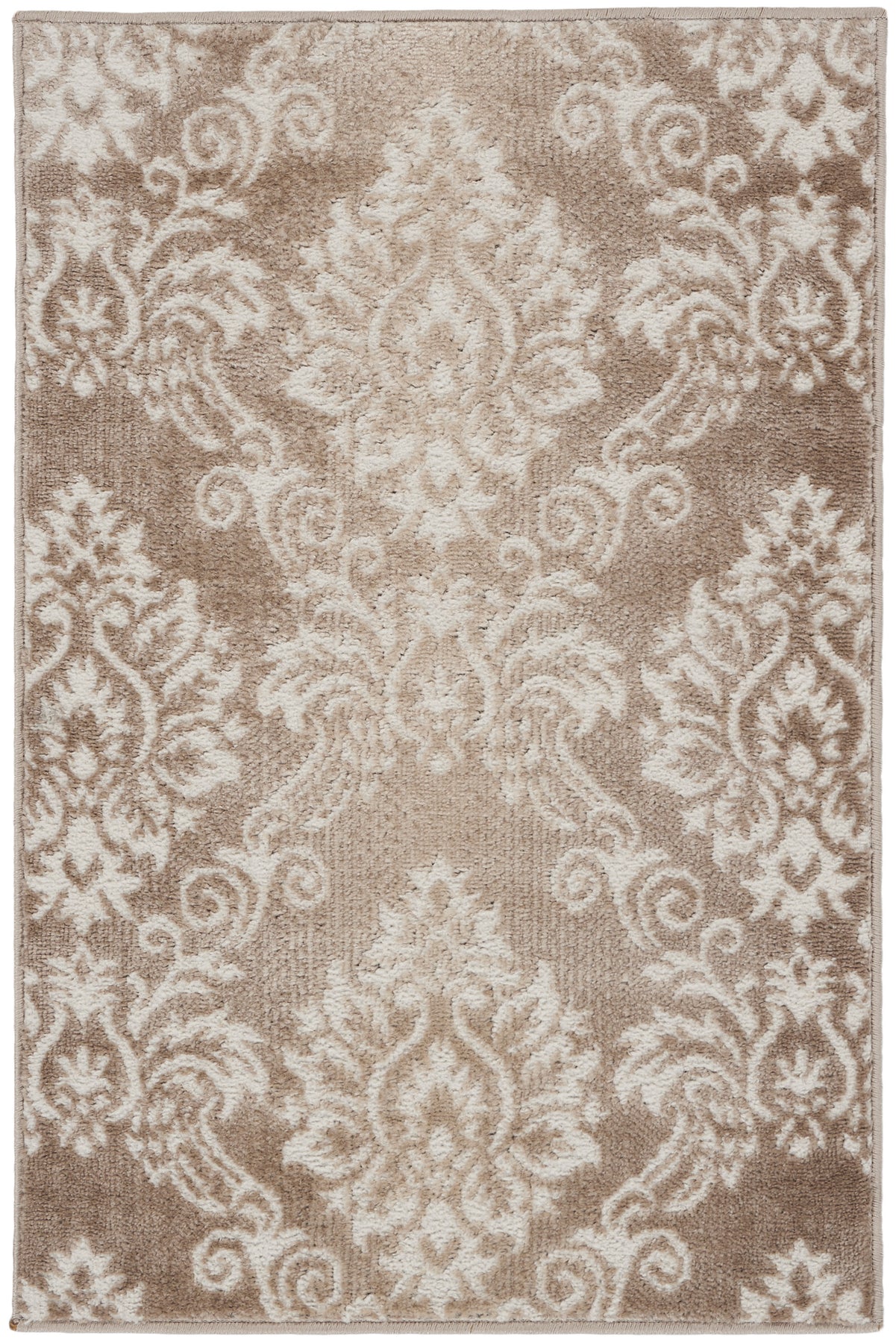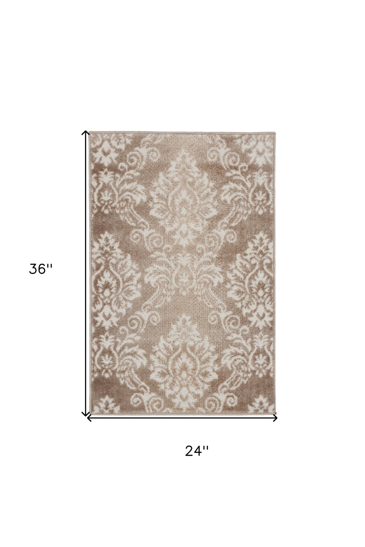 Add some artistry to your room with this 2-foot x 3-foot ivory and brown damask distressed non skid area rug. Ideal for spaces with kids and pets, this rug is stain resistant to help repel dirt and spilled liquids. Built to last, this rug crafted from polypropylene fibers is known for its durability and long lasting appeal. Rugs are a great way to showcase your style, hide imperfections, warm your home and reduce noise. This smaller sized, transitional styled rug is just what you need for your walkway, bedside, in front of door, cabinet, refrigerator, or chair. 24-inch h x 36-inch w x 0.25-inch d