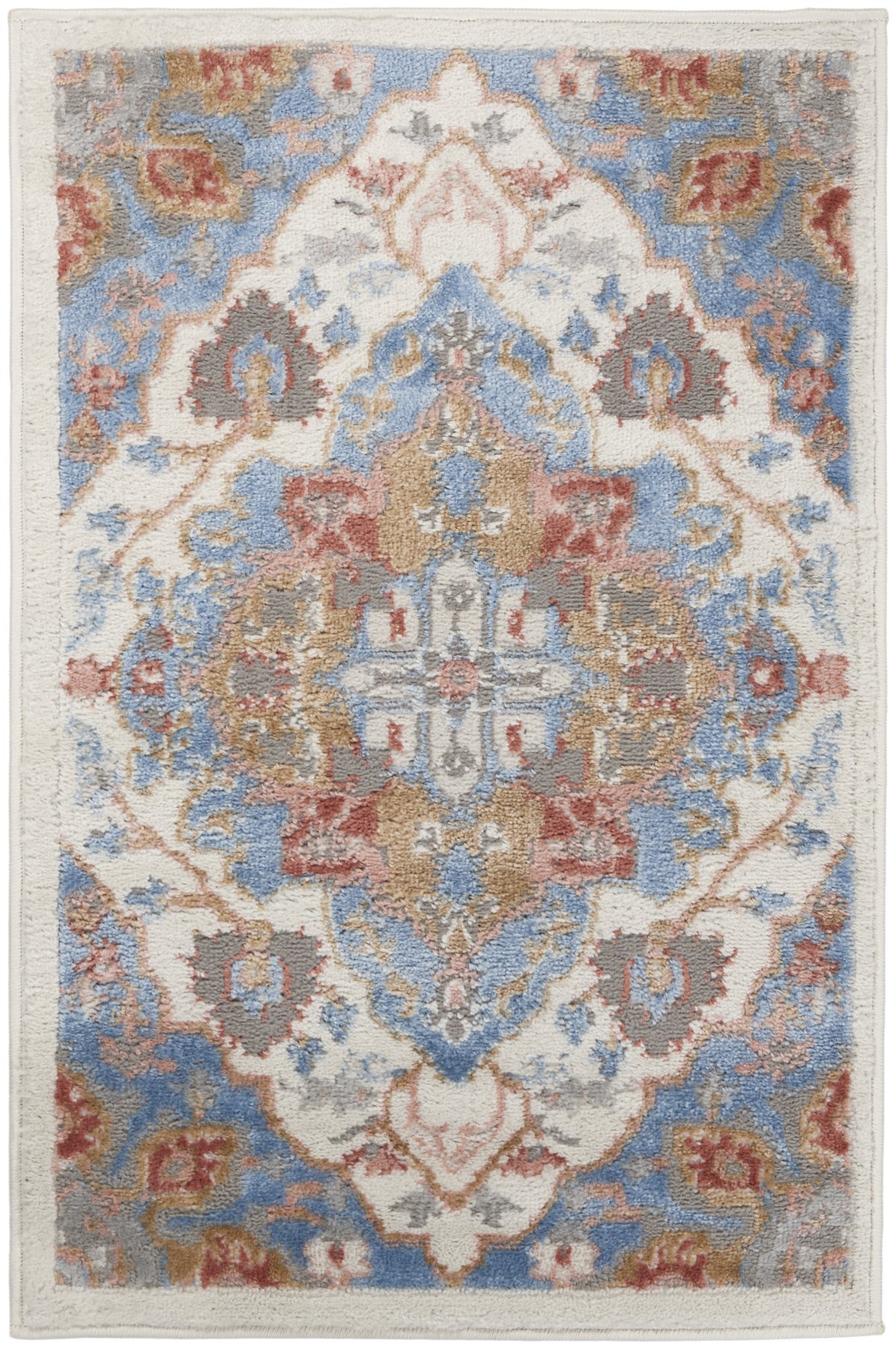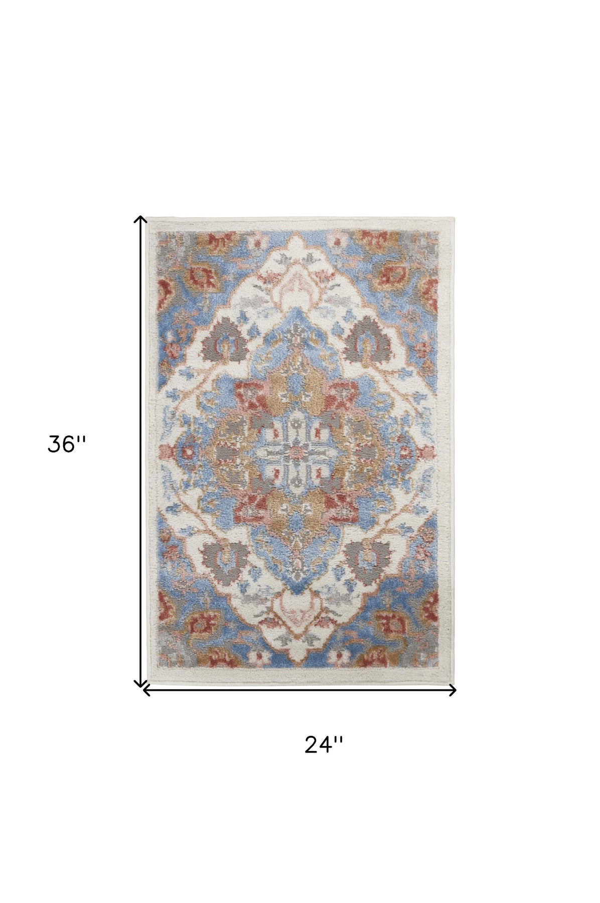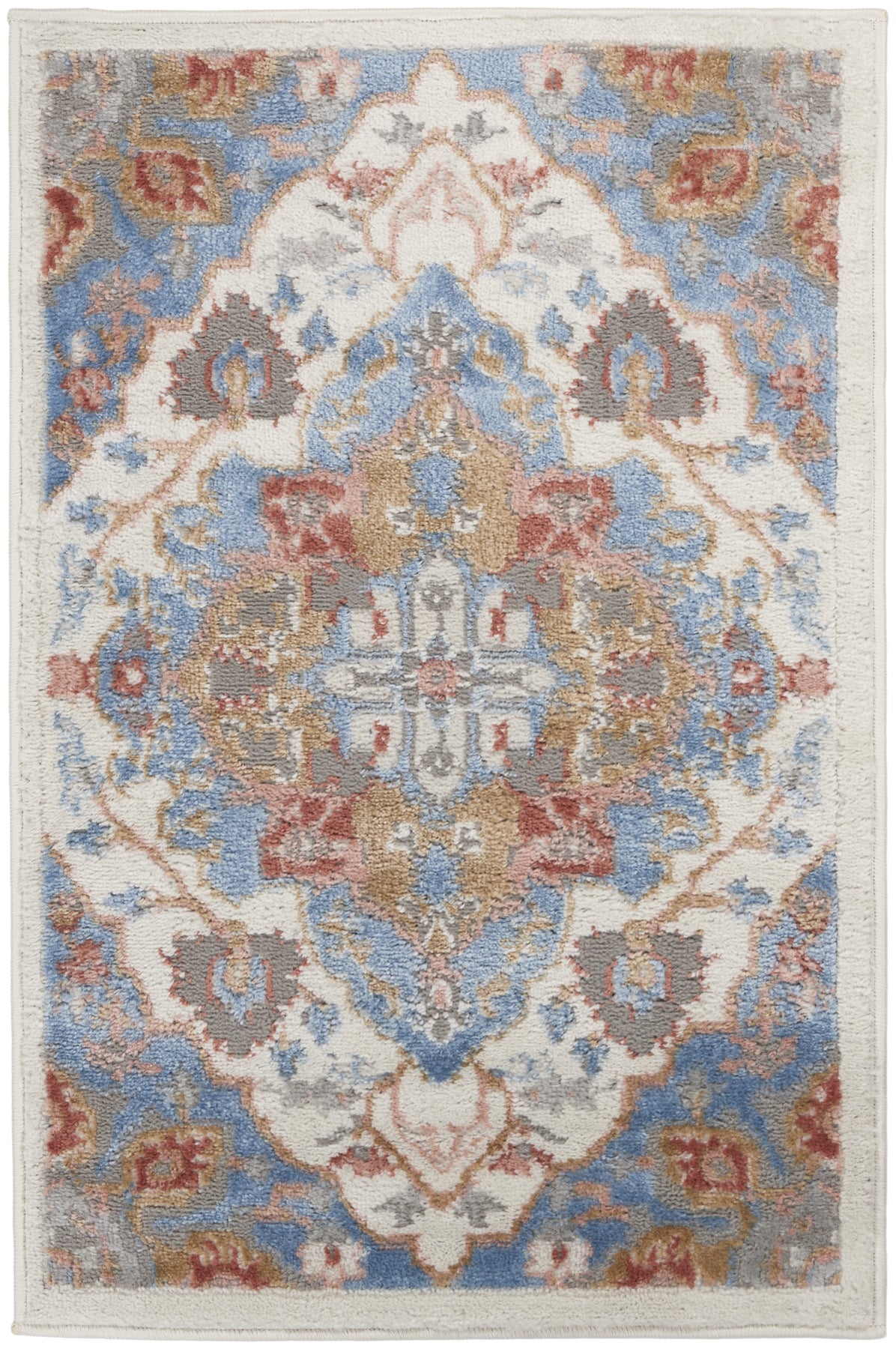 Add some artistry to your room with this 2-foot x 3-foot ivory blue and orange floral non skid area rug. Ideal for spaces with kids and pets, this rug is stain resistant to help repel dirt and spilled liquids. Built to last, this rug crafted from polypropylene fibers is known for its durability and long lasting appeal. Rugs are a great way to showcase your style, hide imperfections, warm your home and reduce noise. This smaller sized, transitional styled rug is just what you need for your walkway, bedside, in front of door, cabinet, refrigerator, or chair. 24-inch h x 36-inch w x 0.25-inch d