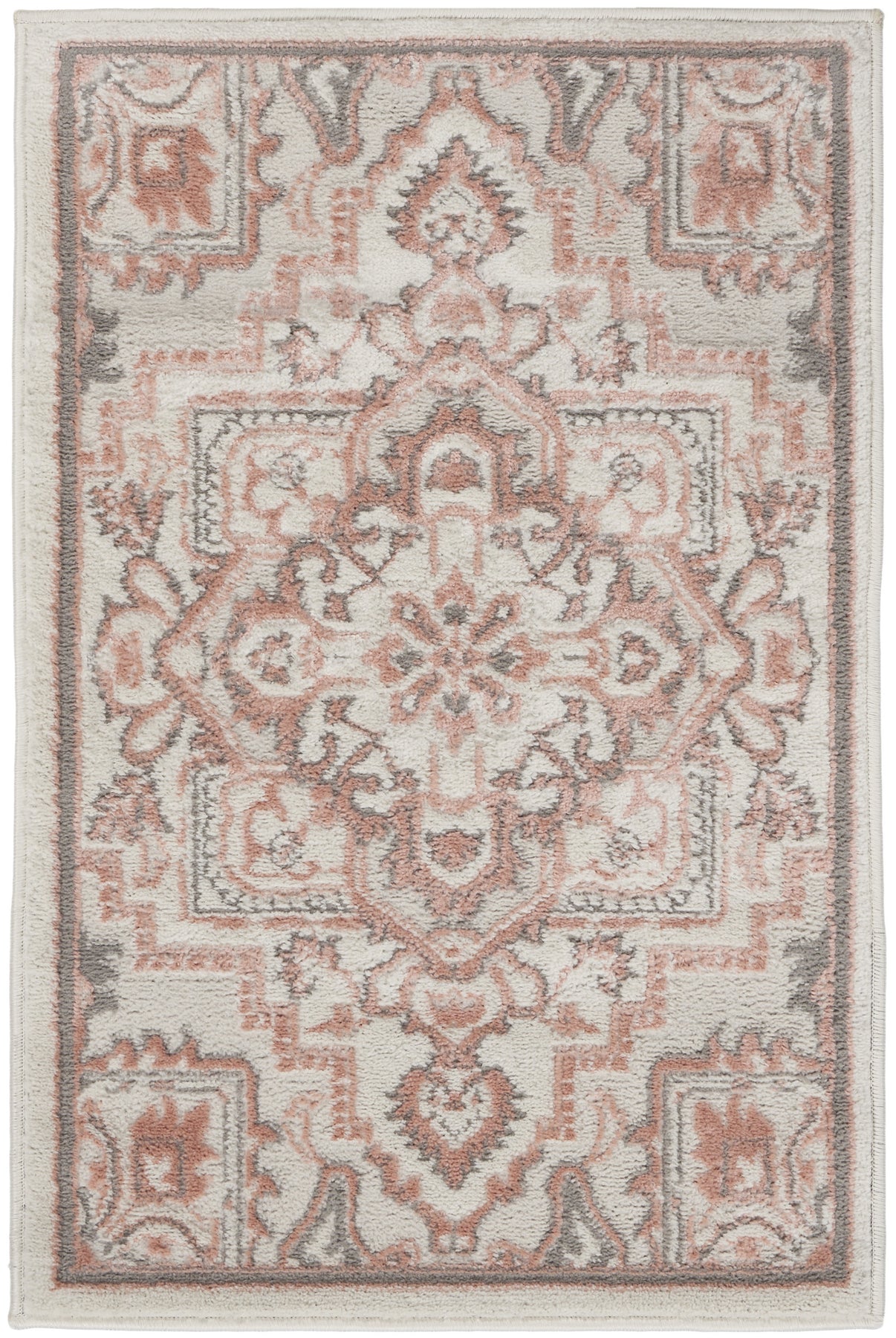 Add some artistry to your room with this 2-foot x 3-foot ivory and red floral non skid area rug. Ideal for spaces with kids and pets, this rug is stain resistant to help repel dirt and spilled liquids. Built to last, this rug crafted from polypropylene fibers is known for its durability and long lasting appeal. Rugs are a great way to showcase your style, hide imperfections, warm your home and reduce noise. This smaller sized, bohemian styled rug is just what you need for your walkway, bedside, in front of door, cabinet, refrigerator, or chair. 24-inch h x 36-inch w x 0.25-inch d