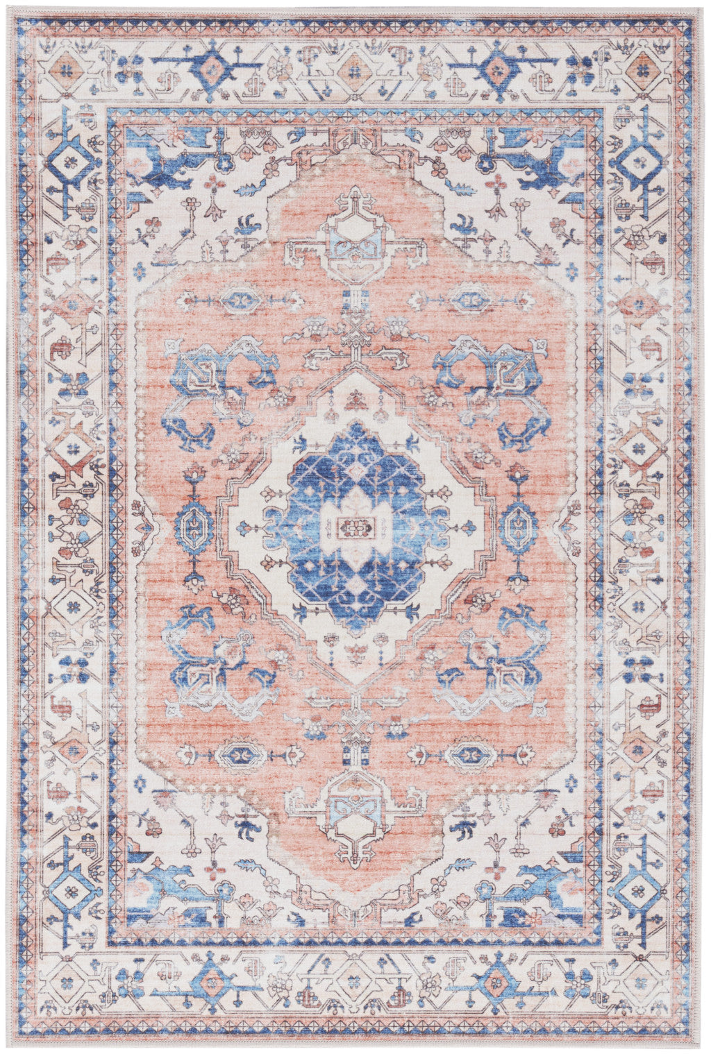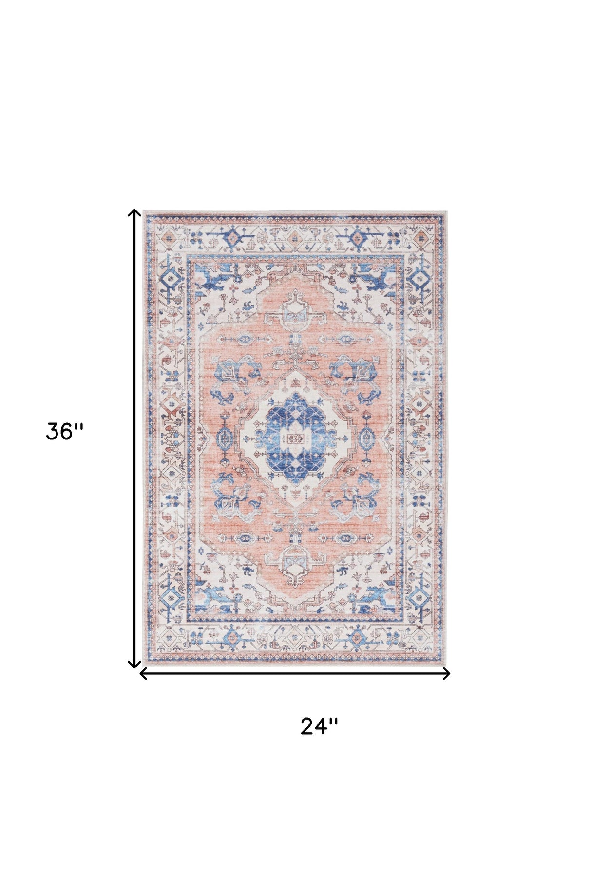 Add some artistry to your room with this 2-foot x 3-foot ivory blue and coral oriental distressed non skid area rug. Ideal for spaces with kids and pets, this rug is stain resistant to help repel dirt and spilled liquids. Built to last, this rug crafted from polyester fibers is known for its durability and long lasting appeal. Rugs are a great way to showcase your style, hide imperfections, warm your home and reduce noise. This smaller sized, rustic styled rug is just what you need for your walkway, bedside, in front of door, cabinet, refrigerator, or chair. 24-inch h x 36-inch w x 0.25-inch d