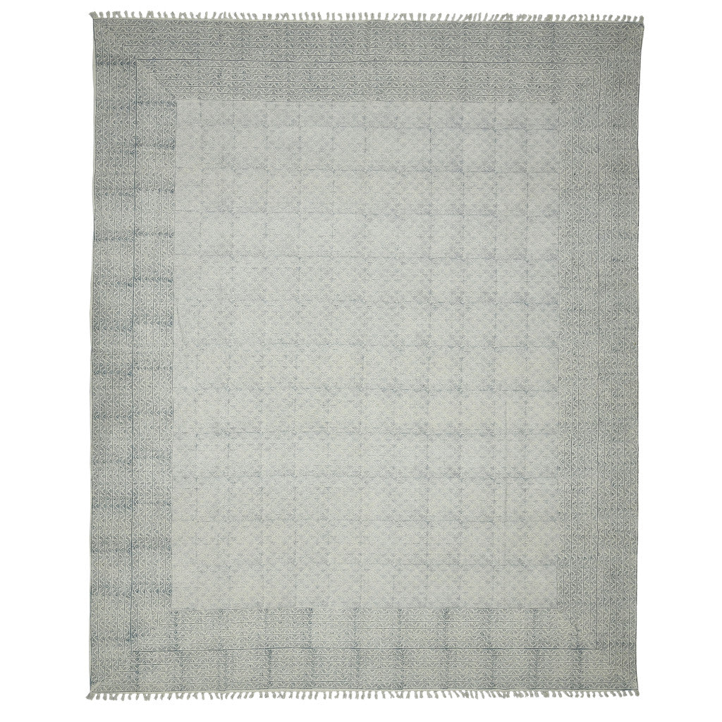 Set an inviting tone in your space with this 2-foot x 3-foot ivory blue and black geometric flatweave handmade distressed area rug with fringe. Rugs are a great way to showcase your style, hide imperfections, warm your home and reduce noise. Tassel ends bring a timeless and fashionable look to your interior. This smaller sized, transitional styled rug is just what you need for your walkway, bedside, in front of door, cabinet, refrigerator, or chair. 24-inch h x 36-inch w x 0.2-inch d.