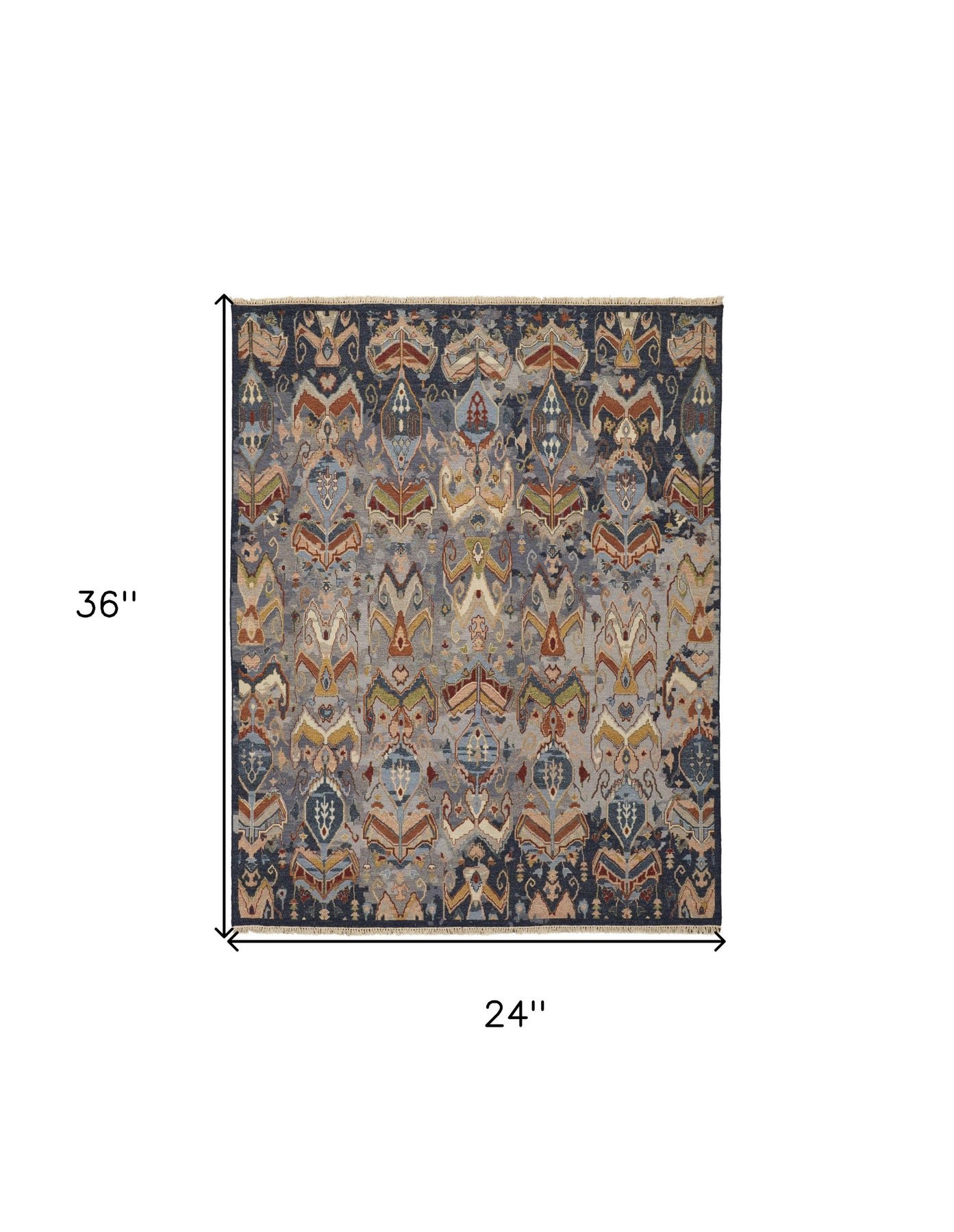 Set an inviting tone in your space with this 2-foot x 3-foot blue gray and brown wool ikat hand knotted area rug with fringe. Crafted by skilled artisans, this hand knotted rug is genuine and unique. No two will be exactly alike. This rectangle shaped rug features a ikat design that will add a functional and decorative accent to your space. Ideal for spaces with kids and pets, this rug is stain resistant to help repel dirt and spilled liquids. Tassel ends bring a timeless and fashionable look to your interior. This smaller sized rug is just what you need for your walkway, or in front of door, cabinet, refrigerator, or chair. 24-inch h x 36-inch w x 0.2-inch d
