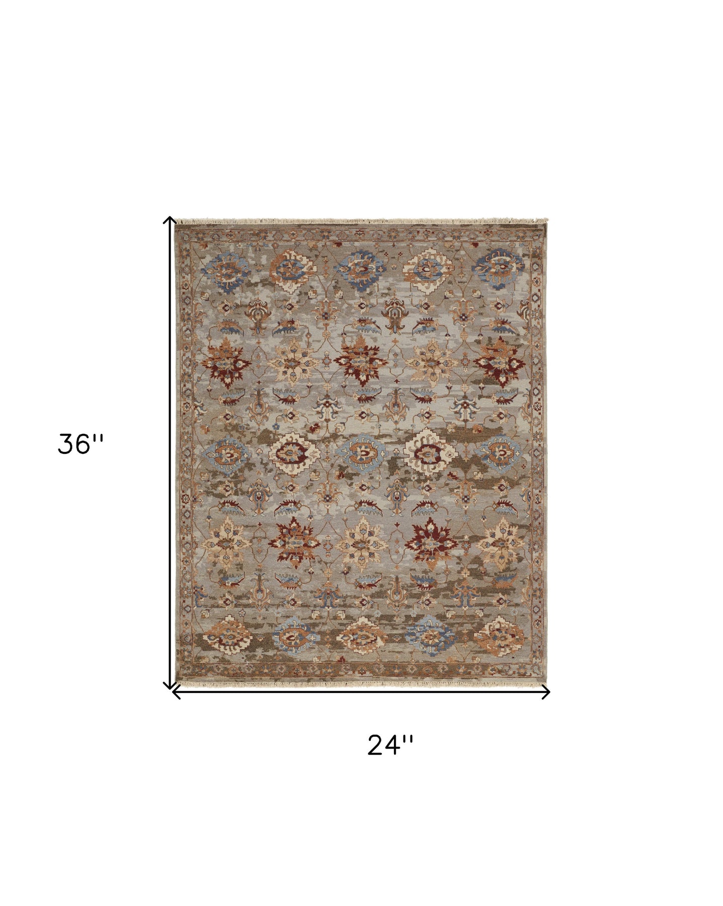 Set an inviting tone in your space with this 2-foot x 3-foot tan brown and gray wool floral hand knotted area rug with fringe. Crafted by skilled artisans, this hand knotted rug is genuine and unique. No two will be exactly alike. This rectangle shaped rug features a floral design that will add a functional and decorative accent to your space. Ideal for spaces with kids and pets, this rug is stain resistant to help repel dirt and spilled liquids. Tassel ends bring a timeless and fashionable look to your interior. This smaller sized rug is just what you need for your walkway, or in front of door, cabinet, refrigerator, or chair. 24-inch h x 36-inch w x 0.2-inch d