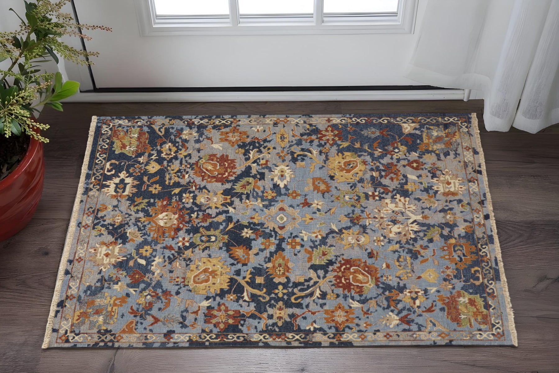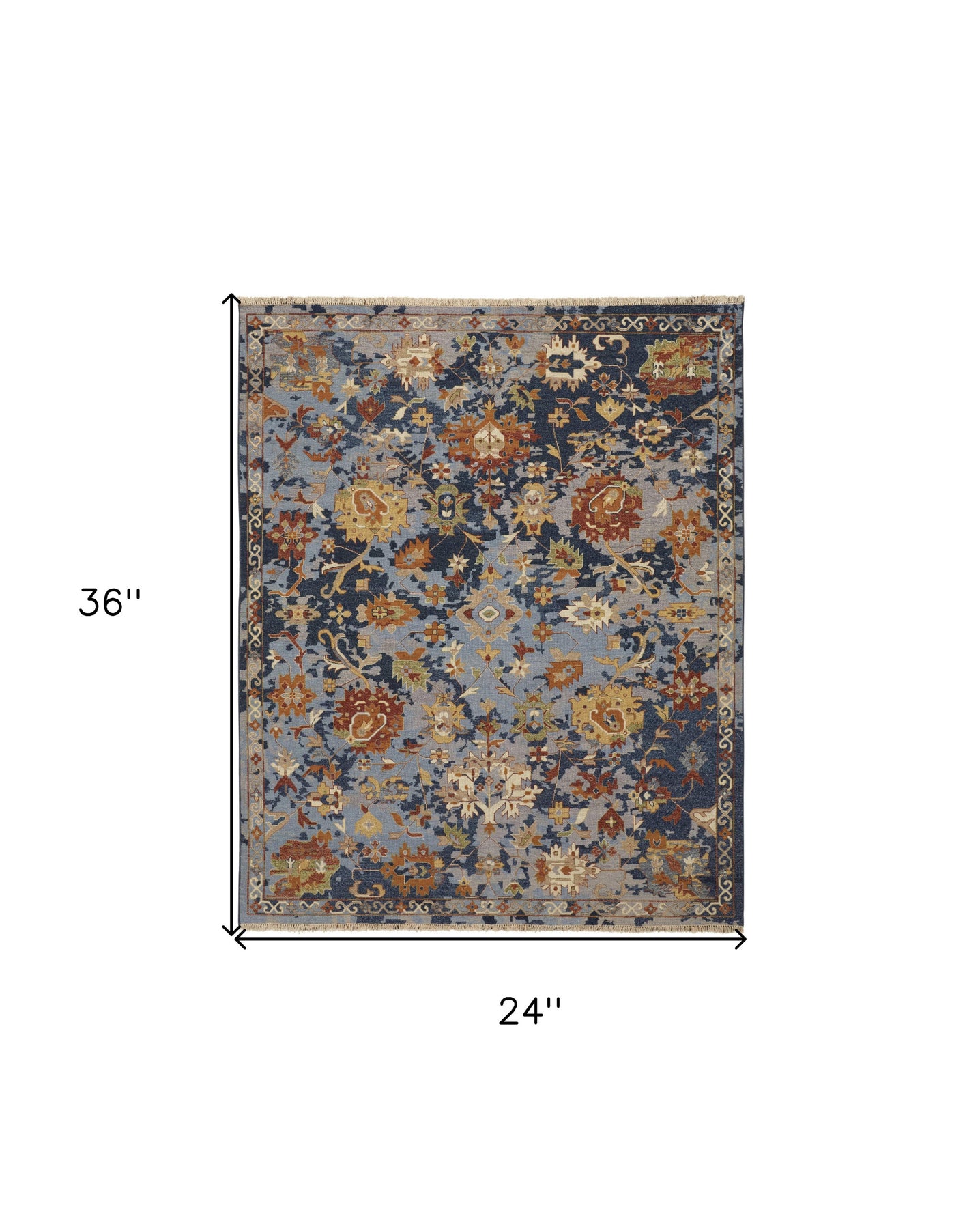 This 2-foot x 3-foot blue gray and red wool floral hand knotted area rug with fringe, is a great way to add warmth to a room. Crafted by skilled artisans, this hand knotted rug is genuine and unique. No two will be exactly alike. This rectangle shaped rug features a floral design that will add a functional and decorative accent to your space. Ideal for spaces with kids and pets, this rug is stain resistant to help repel dirt and spilled liquids. Tassel ends bring a timeless and fashionable look to your interior. This smaller sized rug is just what you need for your walkway, or in front of door, cabinet, refrigerator, or chair. 24-inch h x 36-inch w x 0.2-inch d
