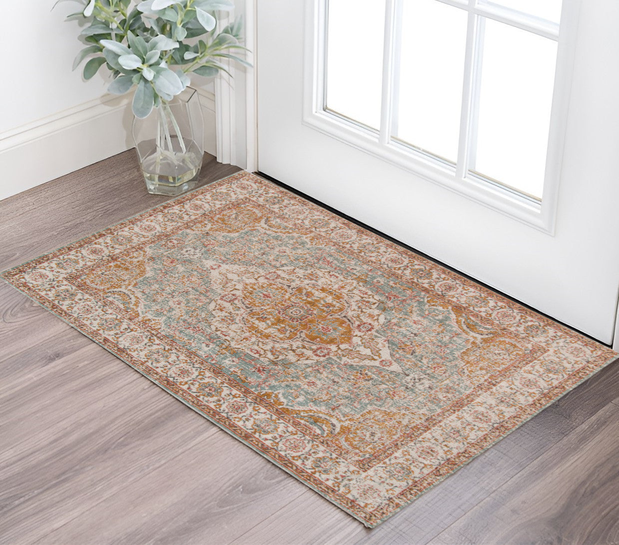 This 2-foot x 3-foot orange oriental area rug, is a great way to add warmth to a room. Ideal for spaces with kids and pets, this rug is stain resistant to help repel dirt and spilled liquids. Built to last, this rug crafted from polypropylene fibers is known for its durability and long lasting appeal. Rugs are a great way to showcase your style, hide imperfections, warm your home and reduce noise. This smaller sized, traditional styled rug is just what you need for your walkway, bedside, in front of door, cabinet, refrigerator, or chair. 26-inch h x 36-inch w x 0.15-inch d.