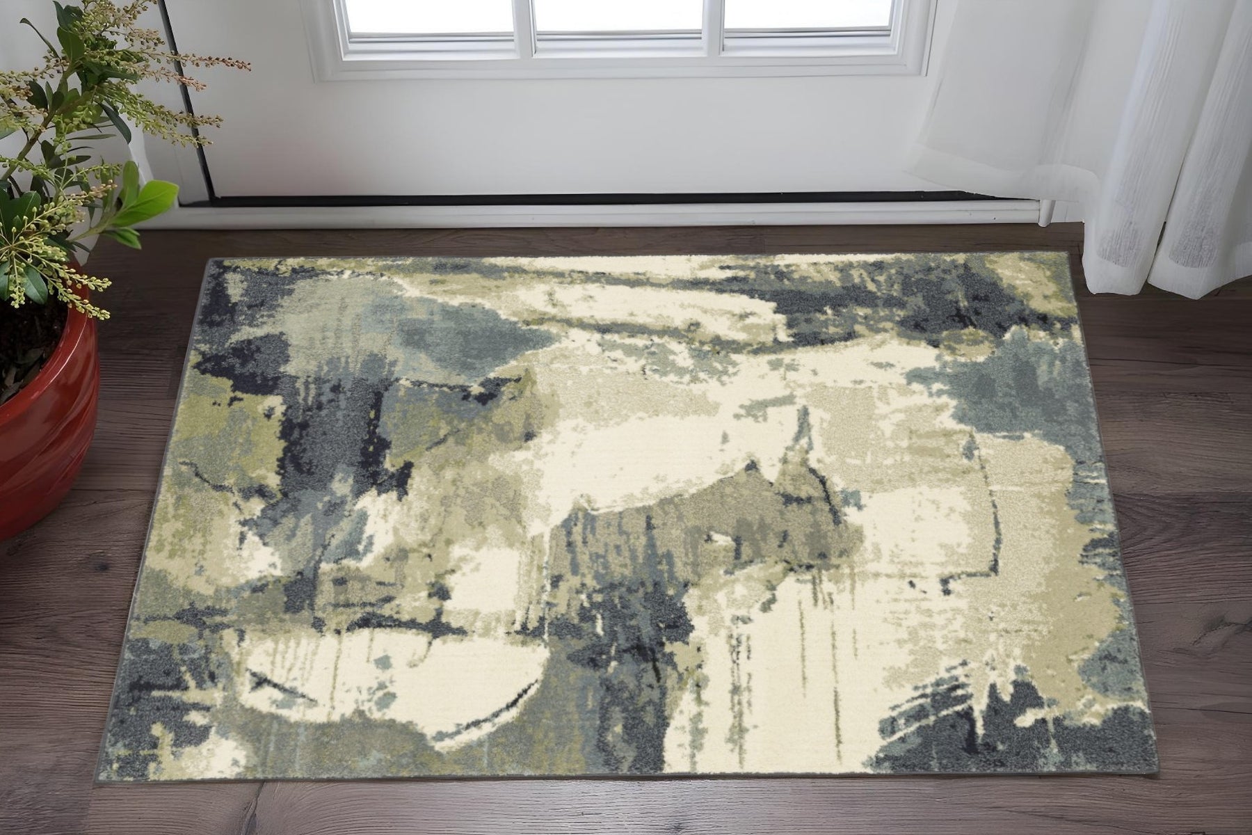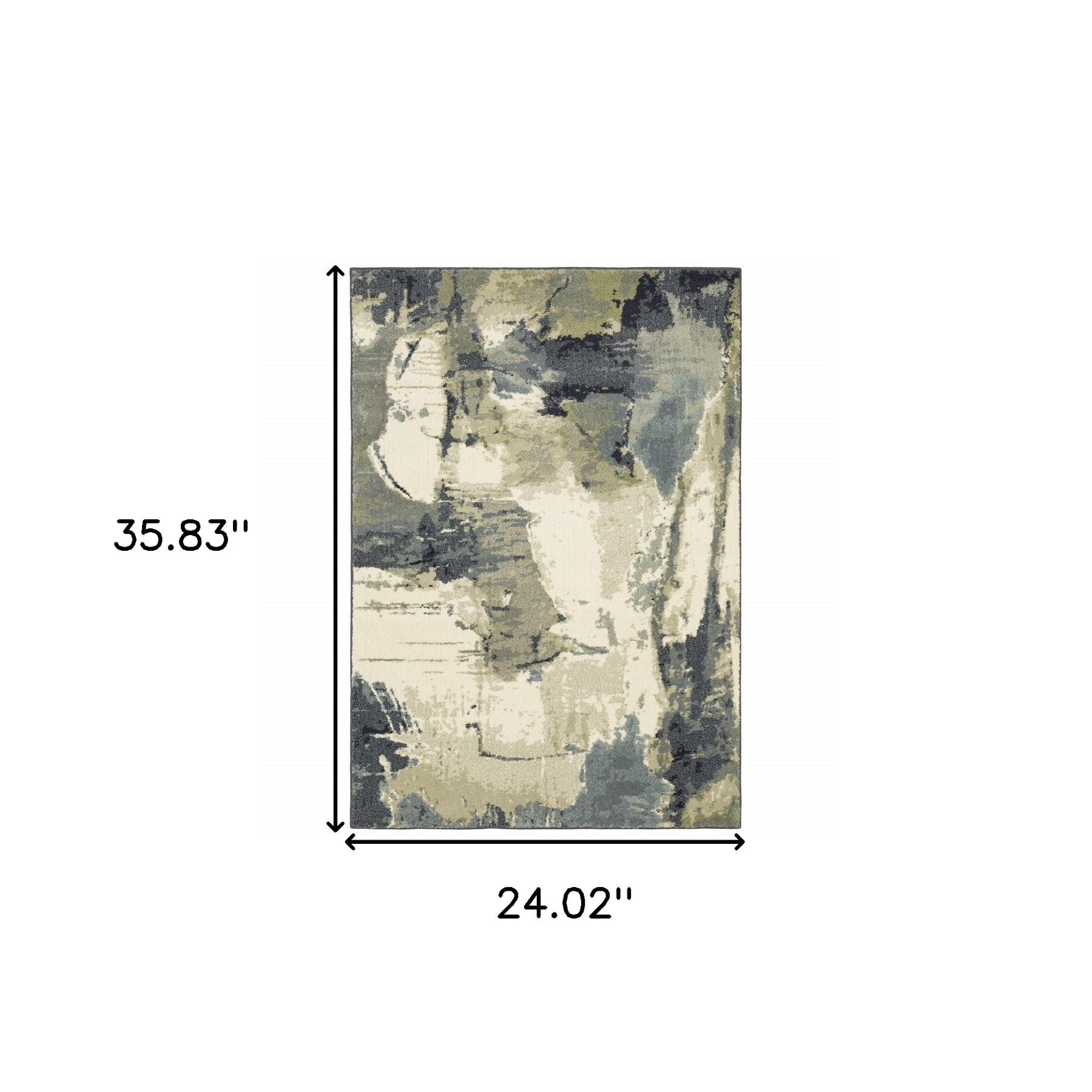 This 2' x 3' blue light blue grey sage beige and ivory abstract power loom stain resistant area rug, is a great way to add warmth to a room. This rectangle shaped rug features a abstract design in blue light blue grey sage beige and ivory to give it visual interest. A classic shape marries with good looking design for your space Ideal for spaces with kids and pets, this rug is stain resistant to help repel stains and spilled liquids. Place this area rug against a hardwood or tile floor and it will enliven your living space with style and sophistication. 0.79" H x 24.02" W x 35.83" D