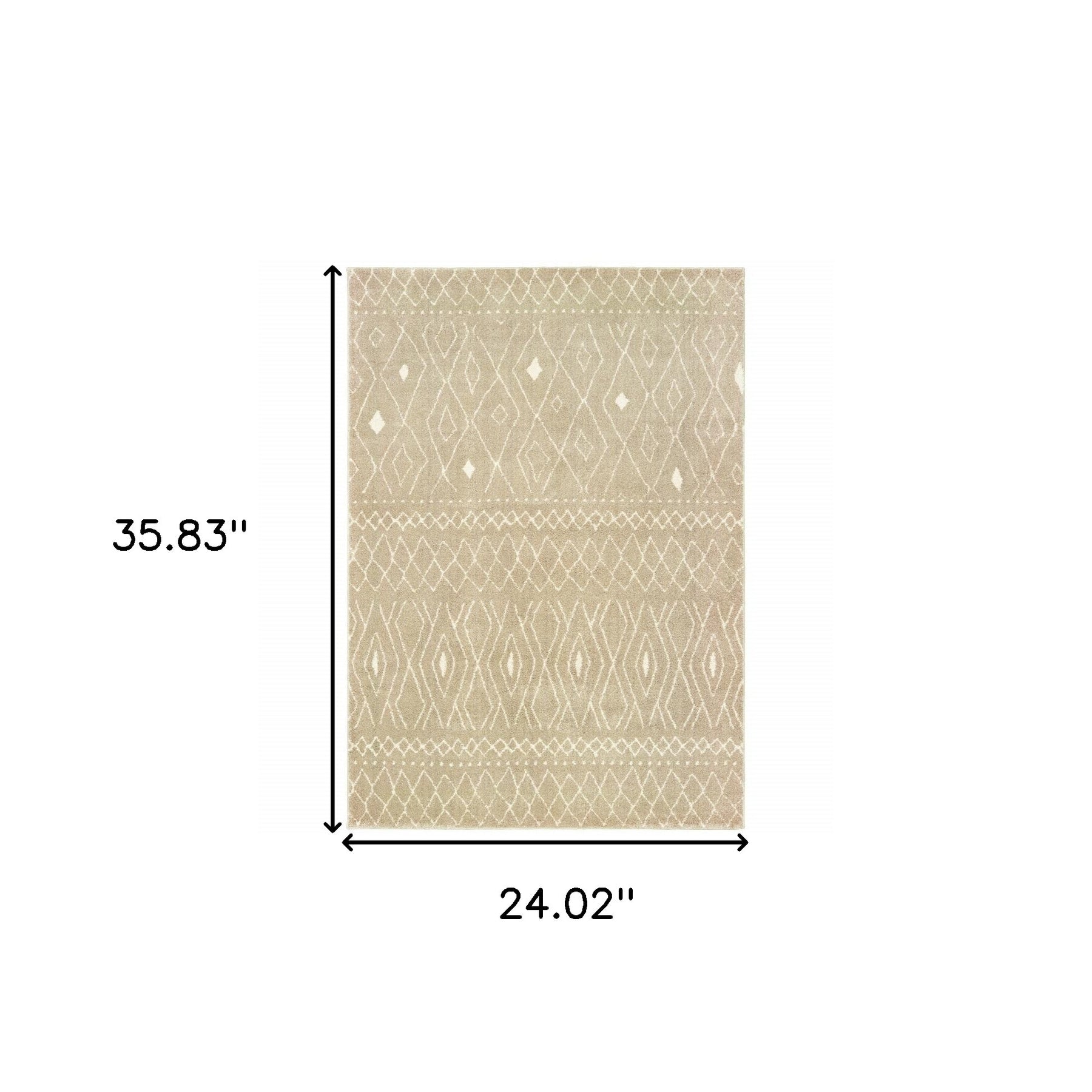 Set an inviting tone in your space with this 2' x 3' sand and ivory geometric power loom stain resistant area rug. This rectangle shaped rug features a geometric design in sand and ivory to give it visual interest. A classic shape marries with good looking design for your space Ideal for spaces with kids and pets, this rug is stain resistant to help repel stains and spilled liquids. Area Rugs help to give warmth and sense of home to your space. 0.78" H x 24.02" W x 35.83" D