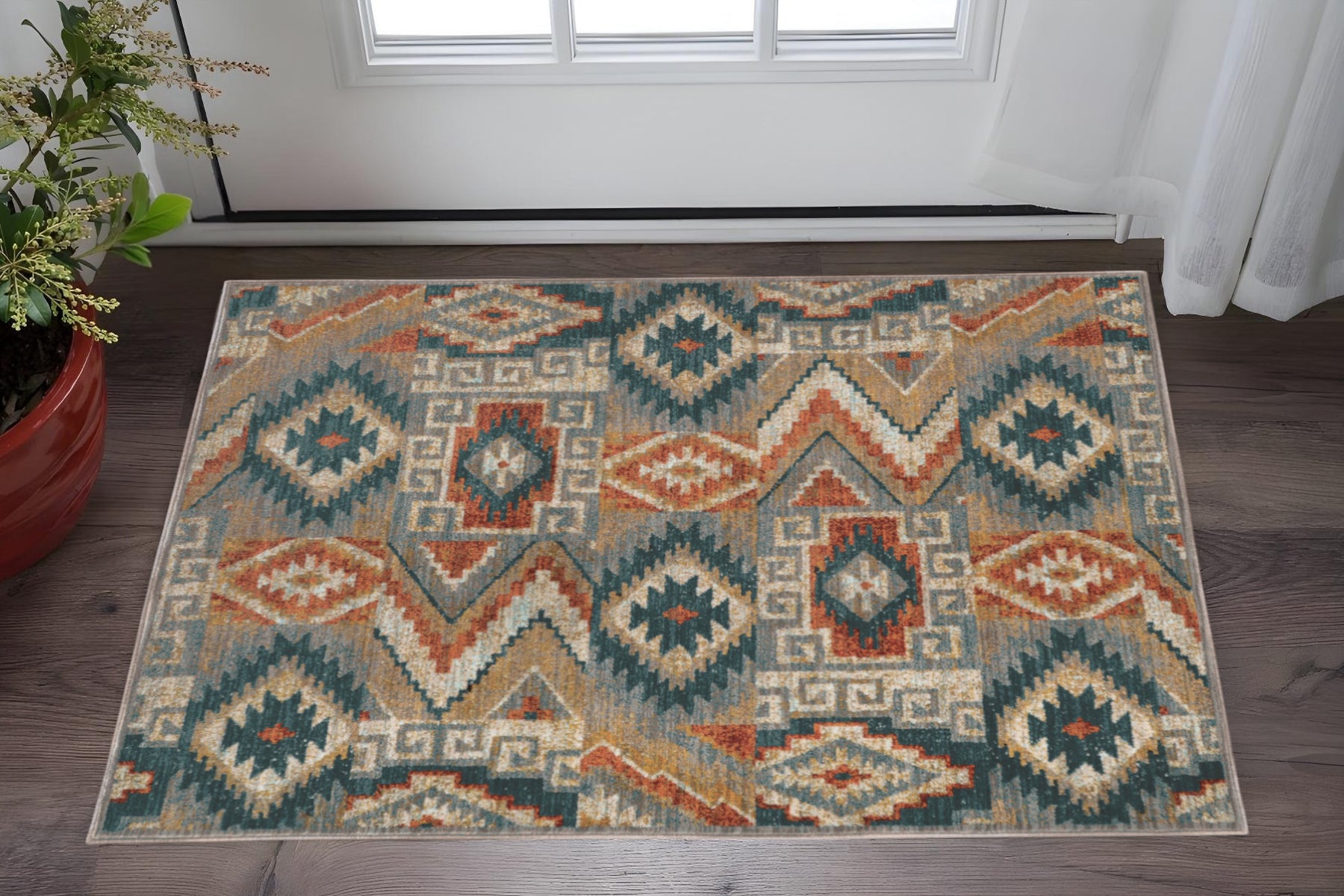 Add great coloration and comfortable texture to your space with this 2' x 3' blue teal grey orange gold ivory and rust geometric power loom stain resistant area rug. This rectangle shaped rug features a geometric design in blue teal grey orange gold ivory and rust to give it visual interest. A classic shape marries with good looking design for your space Ideal for spaces with kids and pets, this rug is stain resistant to help repel stains and spilled liquids. Place this area rug against a hardwood or tile floor and it will enliven your living space with style and sophistication. 0.39" H x 22.05" W x 35.83" D