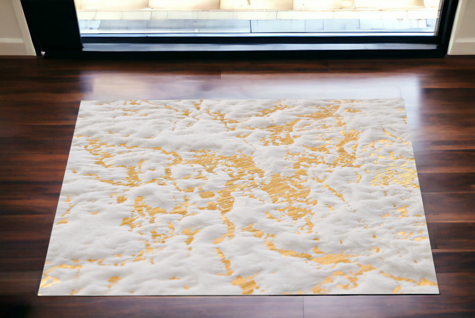 Set an inviting tone in your space with this 2-foot x 3-foot white and gold faux fur abstract shag non skid area rug. This rectangle shaped rug features a abstract design in white and gold to give it visual interest. A classic shape marries with good looking design for your space the retro shag construction of this luxurious rug will provide a soft and comfortable barrier to color tile and hardwood floors. Place this area rug against a hardwood or tile floor and it will enliven your living space with style and sophistication. 24-inch H x 35.5-inch W x 1-inch D
