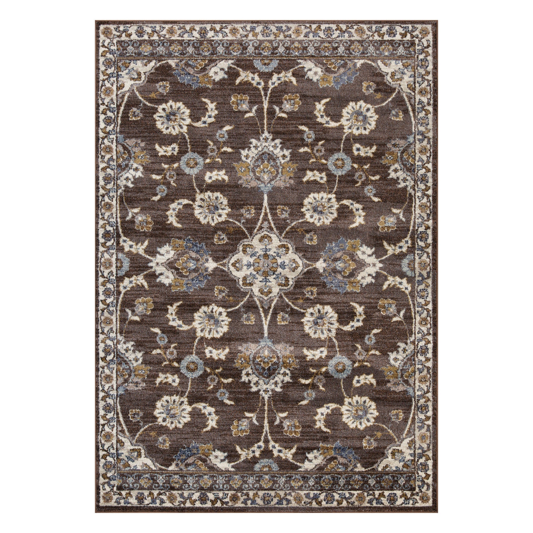 This 2-foot x 3-foot ivory blue and brown floral area rug, is a great way to add warmth to a room. Ideal for spaces with kids and pets, this rug is stain resistant to help repel dirt and spilled liquids. Built to last, this rug crafted from polypropylene fibers is known for its durability and long lasting appeal. Rugs are a great way to showcase your style, hide imperfections, warm your home and reduce noise. This smaller sized, contemporary styled rug is just what you need for your walkway, bedside, in front of door, cabinet, refrigerator, or chair. 22-inch h x 35-inch w x 0.4-inch d.