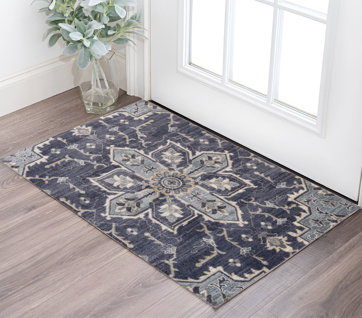 Set an inviting tone in your space with this 2-foot x 3-foot ivory gray and purple floral medallion area rug. Ideal for spaces with kids and pets, this rug is stain resistant to help repel dirt and spilled liquids. Built to last, this rug crafted from polypropylene fibers is known for its durability and long lasting appeal. Rugs are a great way to showcase your style, hide imperfections, warm your home and reduce noise. This smaller sized, traditional styled rug is just what you need for your walkway, bedside, in front of door, cabinet, refrigerator, or chair. 22-inch h x 35-inch w x 0.4-inch d.