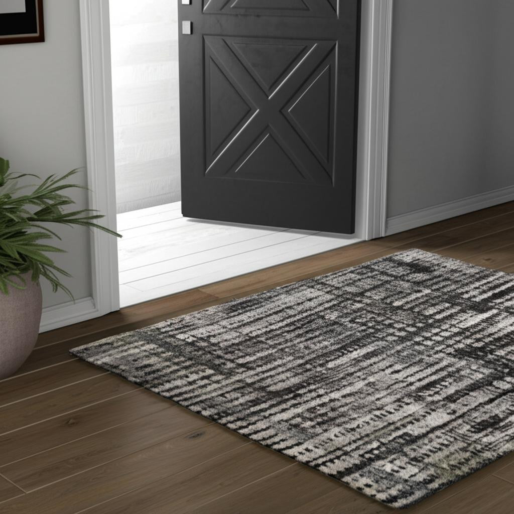 Add great coloration and comfortable texture to your space with this 2-foot x 3-foot gray black and ivory abstract distressed area rug. Ideal for spaces with kids and pets, this rug is stain resistant to help repel dirt and spilled liquids. Built to last, this rug crafted from polypropylene blend fibers is known for its durability and long lasting appeal. Rugs are a great way to showcase your style, hide imperfections, warm your home and reduce noise. This smaller sized, industrial styled rug is just what you need for your walkway, bedside, in front of door, cabinet, refrigerator, or chair. 21-inch h x 34-inch w x 1-inch d.