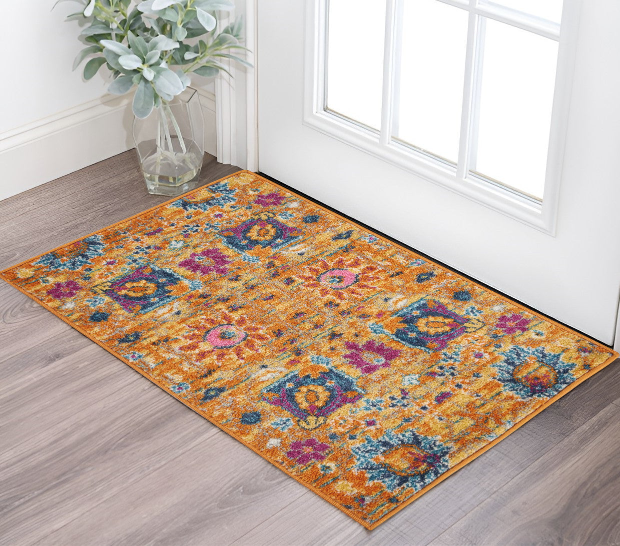 This 2-foot x 3-foot blue and orange floral distressed area rug, is a great way to add warmth to a room. Built to last, this rug crafted from polypropylene fibers is known for its durability and long lasting appeal. Rugs are a great way to showcase your style, hide imperfections, warm your home and reduce noise. This smaller sized, transitional styled rug is just what you need for your walkway, bedside, in front of door, cabinet, refrigerator, or chair. 22-inch h x 34-inch w x 0.5-inch d.