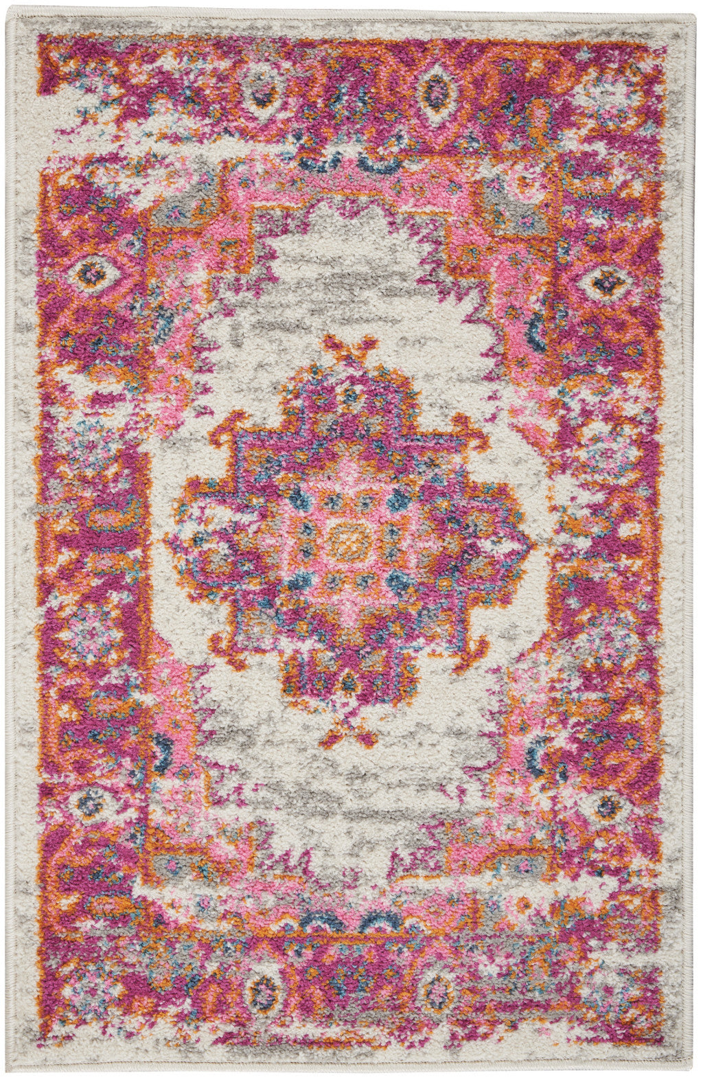 Add some artistry to your room with this 2-foot x 3-foot ivory and fuchsia oriental distressed area rug. Built to last, this rug crafted from polypropylene fibers is known for its durability and long lasting appeal. Rugs are a great way to showcase your style, hide imperfections, warm your home and reduce noise. This smaller sized, transitional styled rug is just what you need for your walkway, bedside, in front of door, cabinet, refrigerator, or chair. 22-inch h x 34-inch w x 0.5-inch d.
