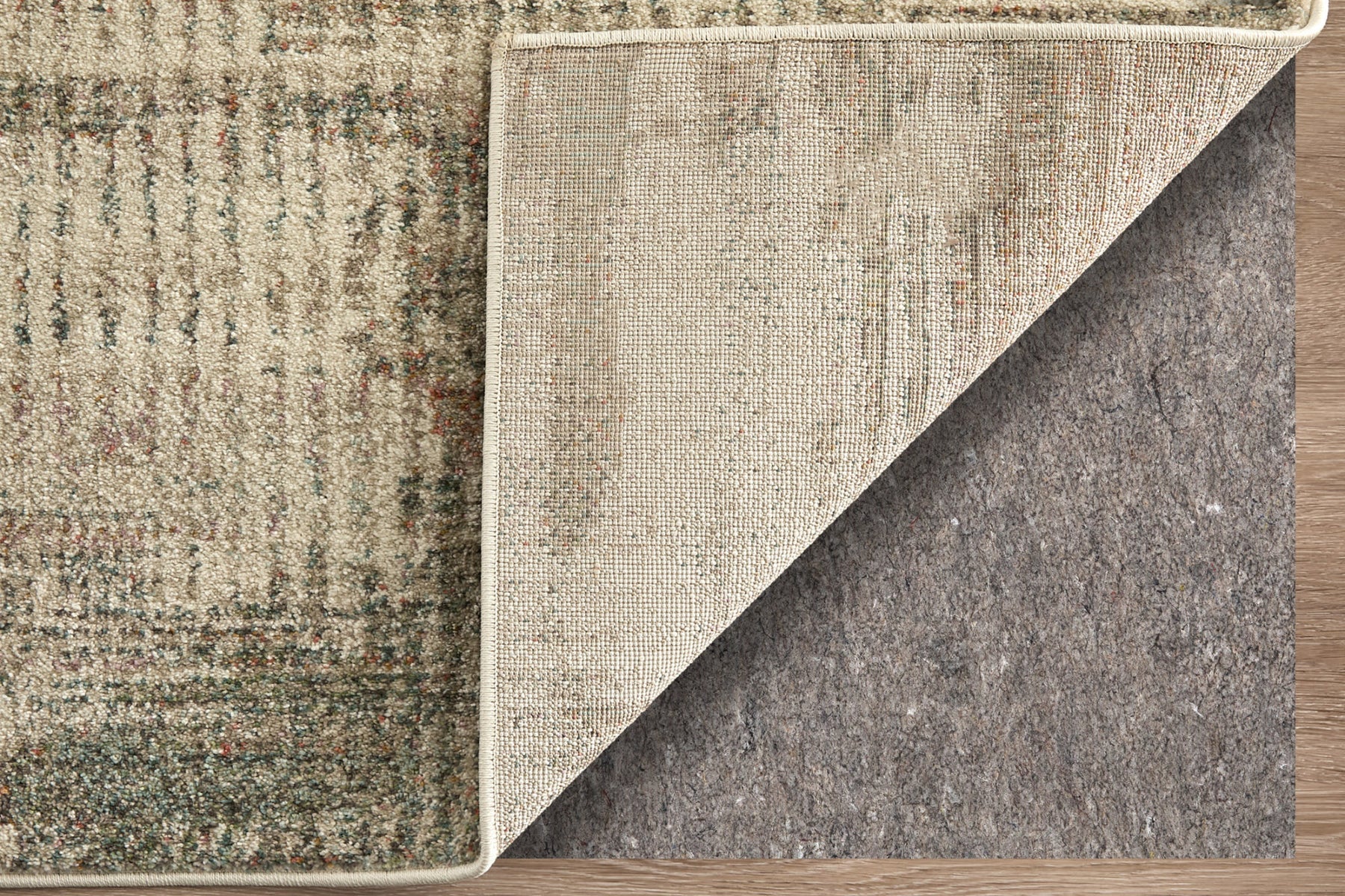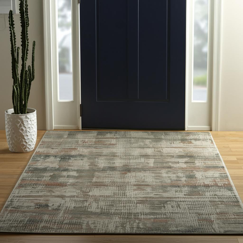 Add some artistry to your room with this 2-foot x 3-foot ivory gray and green abstract distressed area rug. Ideal for spaces with kids and pets, this rug is stain resistant to help repel dirt and spilled liquids. Built to last, this rug crafted from polypropylene blend fibers is known for its durability and long lasting appeal. Rugs are a great way to showcase your style, hide imperfections, warm your home and reduce noise. This smaller sized, industrial styled rug is just what you need for your walkway, bedside, in front of door, cabinet, refrigerator, or chair. 21-inch h x 34-inch w x 0.47-inch d.