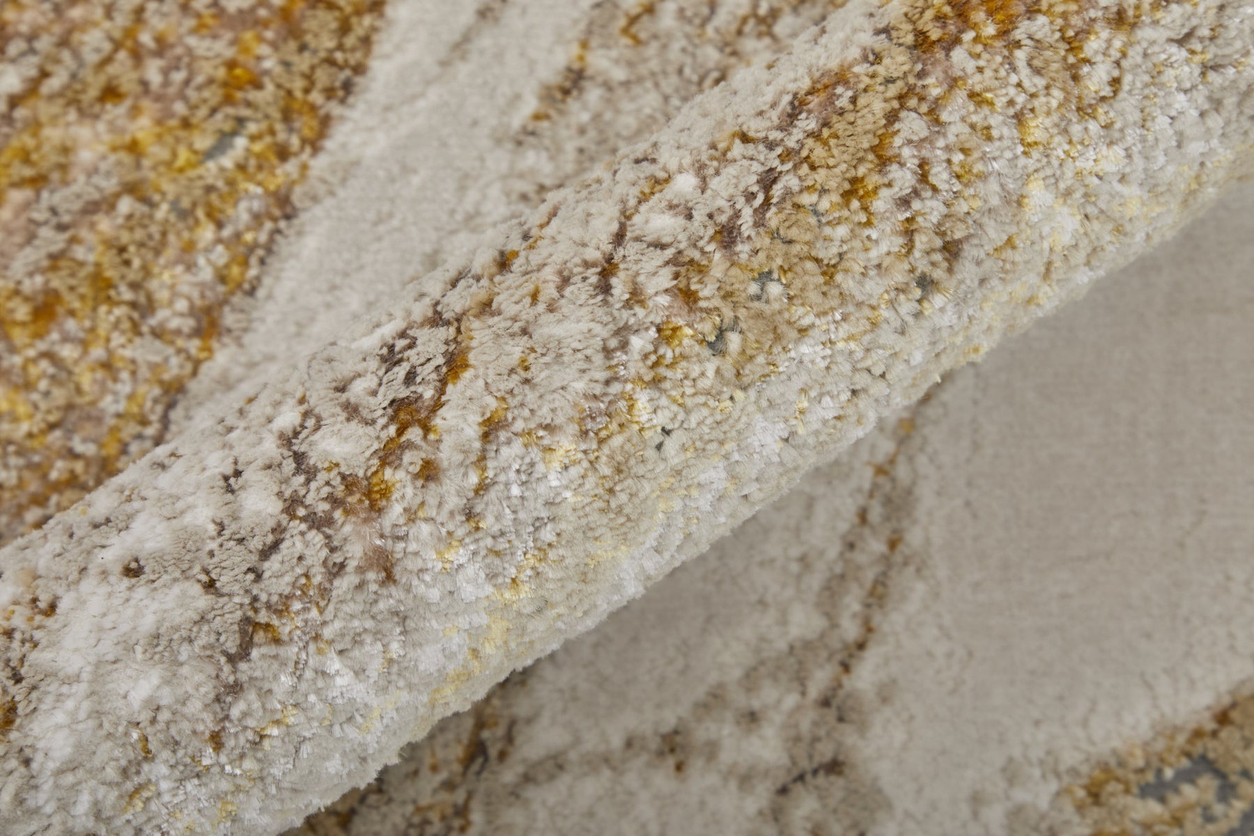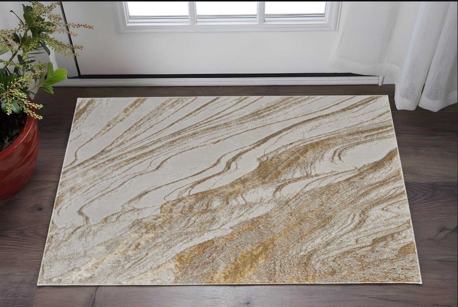 This 2-foot x 3-foot ivory brown and gold abstract power loom area rug, is a great way to add warmth to a room. This rectangle shaped rug features a abstract design in ivory brown and gold to give it visual interest. A classic shape marries with good looking design for your space ideal for spaces with kids and pets, this rug is stain resistant to help repel stains and spilled liquids. Area rugs help to give warmth and sense of home to your space. 20-inch H x 34-inch W x 0.39-inch D