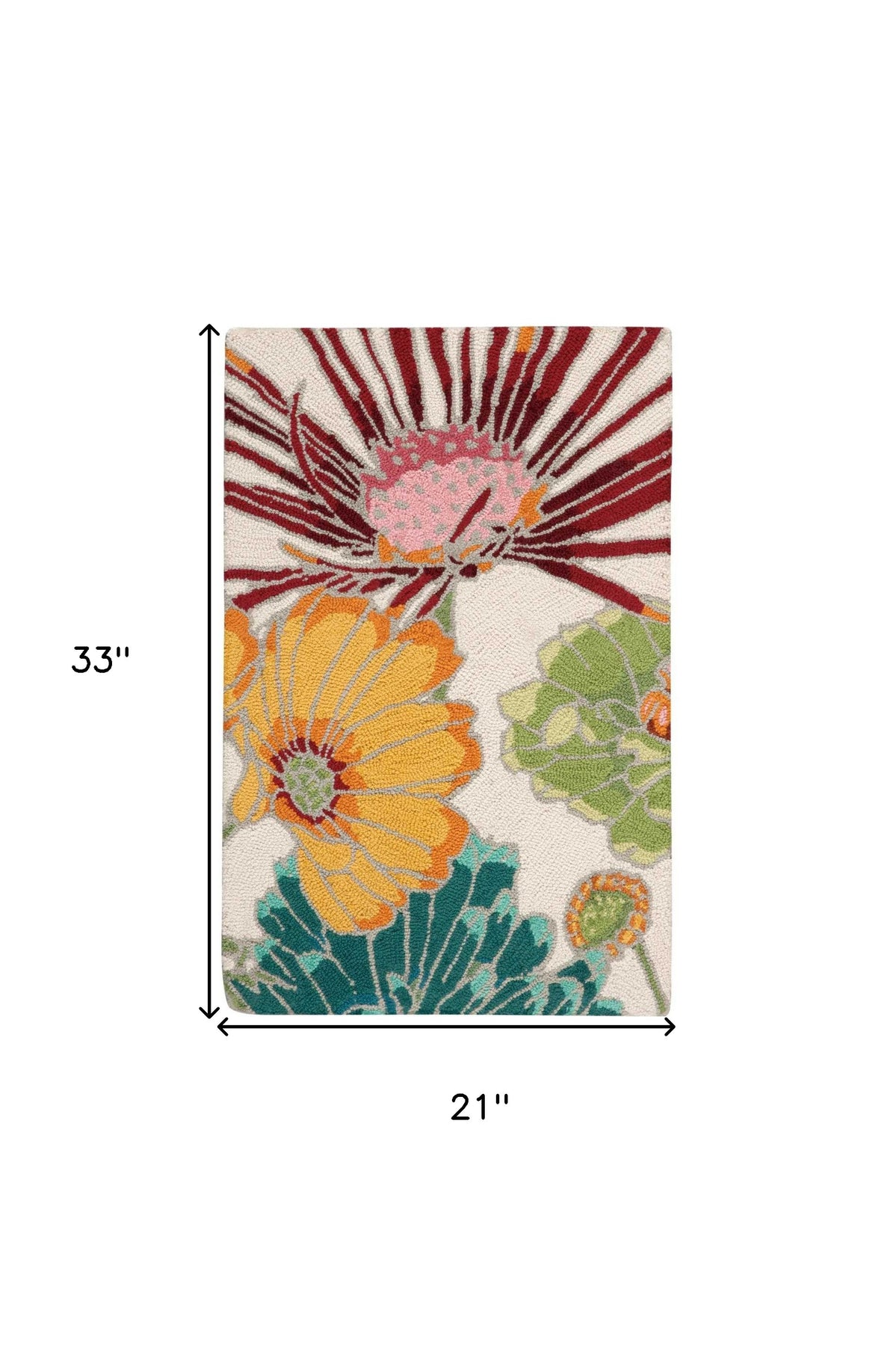 Add great coloration and comfortable texture to your space with this 2-foot x 3-foot ivory red and yellow floral hand carved handmade area rug. Ideal for spaces with kids and pets, this rug is stain resistant to help repel dirt and spilled liquids. Crafted by skilled artisans, this hand carved rug is genuine and unique. No two will be exactly alike. Built to last, this rug crafted from polyester fibers is known for its durability and long lasting appeal. Rugs are a great way to showcase your style, hide imperfections, warm your home and reduce noise. This smaller sized, contemporary styled rug is just what you need for your walkway, bedside, in front of door, cabinet, refrigerator, or chair. 21-inch h x 33-inch w x 0.5-inch d